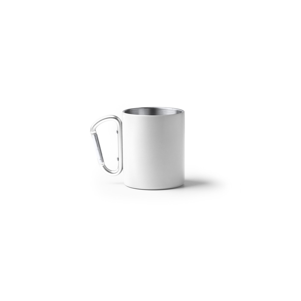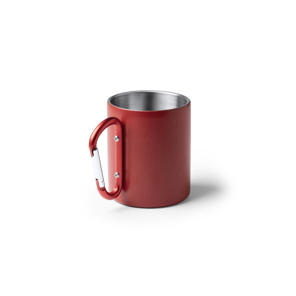 Tasse en acier inoxydable 304 à double paroi avec finition mate. Manche de mousqueton en aluminium recyclé. Capacité 300 ml. Présentation en boîte écodesign.Destinataire :