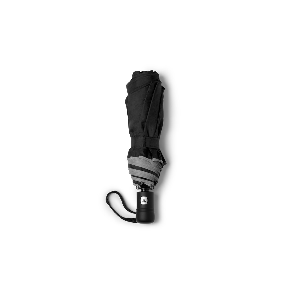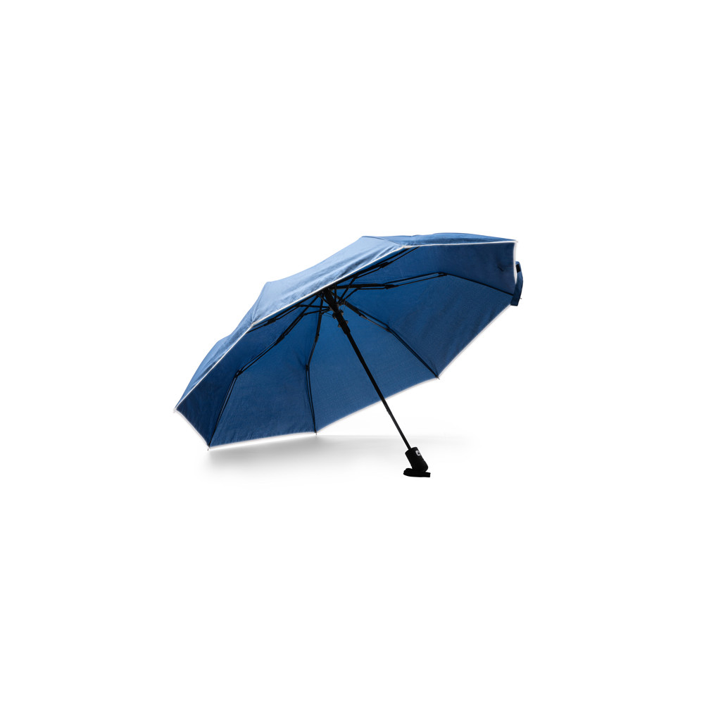 Le parapluie en RPET (polyester recyclé) avec un tissu pongé 190T et une finition en bandes réfléchissantes est une option durable pour vous protéger de la pluie. Le tissu pongé 190T est durable et déperlant, assurant une bonne protection contre la pluie. Les bandes réfléchissantes ajoutent un élément de sécurité car elles réfléchissent la lumière et augmentent la visibilité dans des conditions de faible luminosité.Les tiges en fibre de verre avec un système anti-vent offrent une plus grande résistance et une plus grande flexibilité en cas de rafales de vent, empêchant ainsi le parapluie d'être facilement endommagé. En outre, le parapluie dispose d'un bouton d'ouverture automatique pour une utilisation facile et d'une fermeture Velcro pour un rangement en toute sécDestinataire :