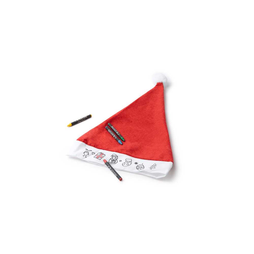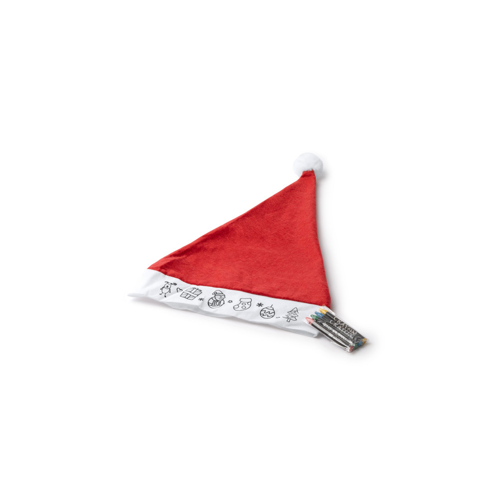 Bonnet de Noel enfant à colorier. Bande avant avec des dessins de Noël. 4 cires colorées incluses.Destinataire :