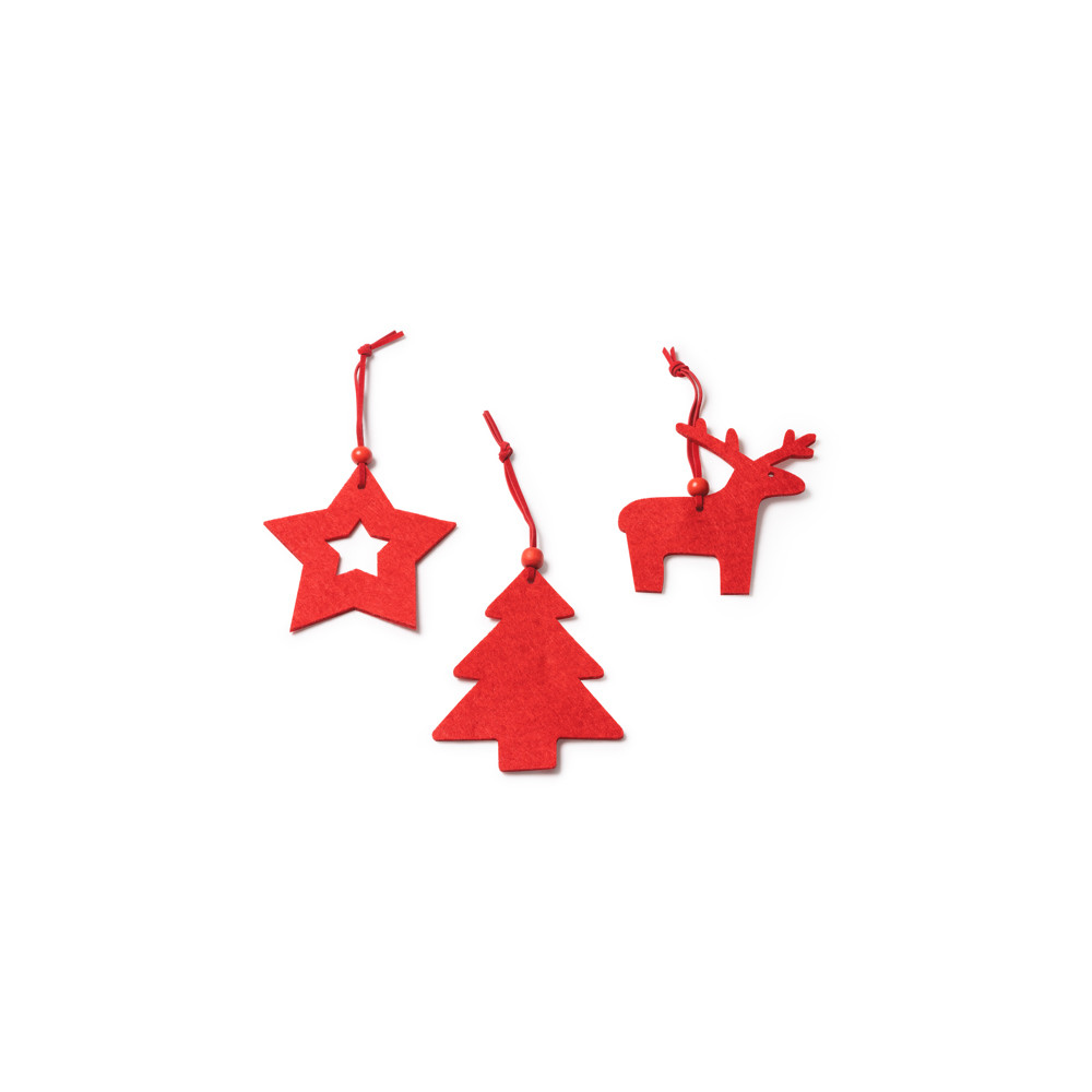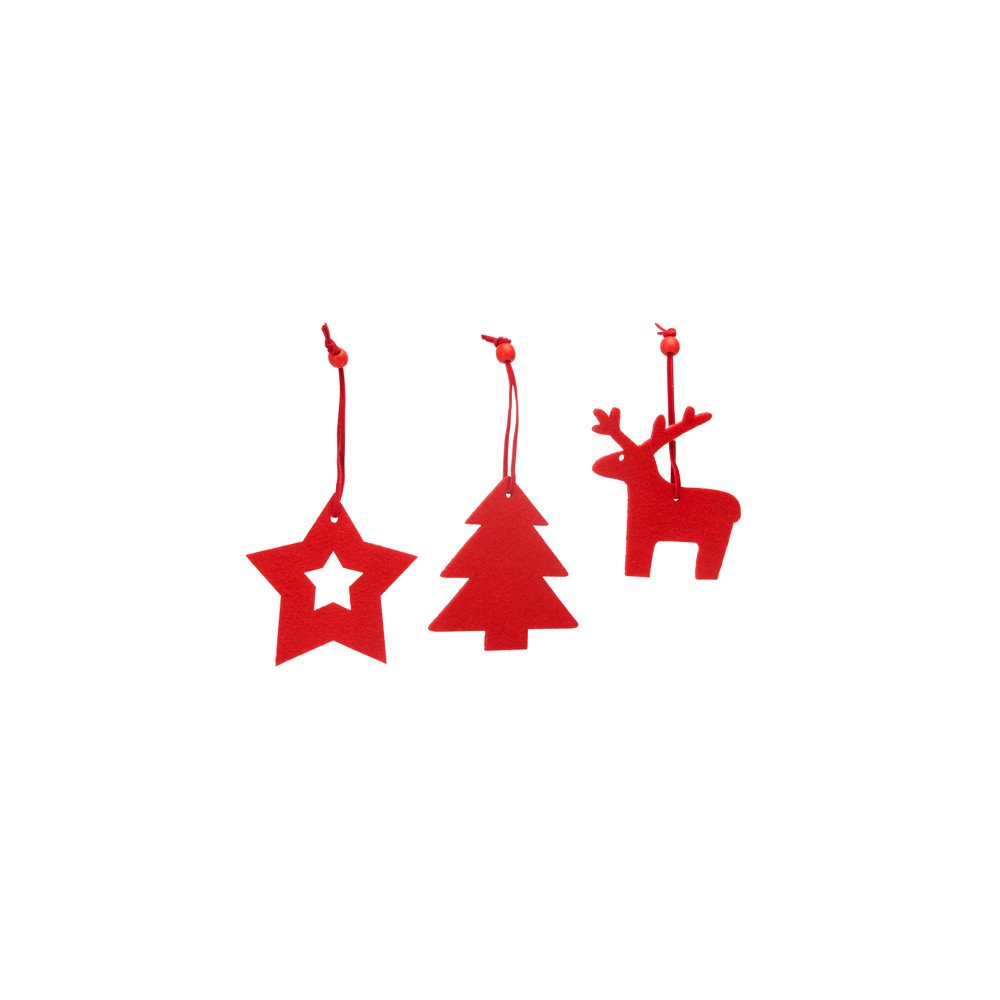 Ensemble de décorations de Noël en papier style buvard, qui comprend trois motifs: étoile, arbre et renne. Les trois sont présentés avec une ficelle rouge et une perle de la même couleur comme finition.Destinataire :