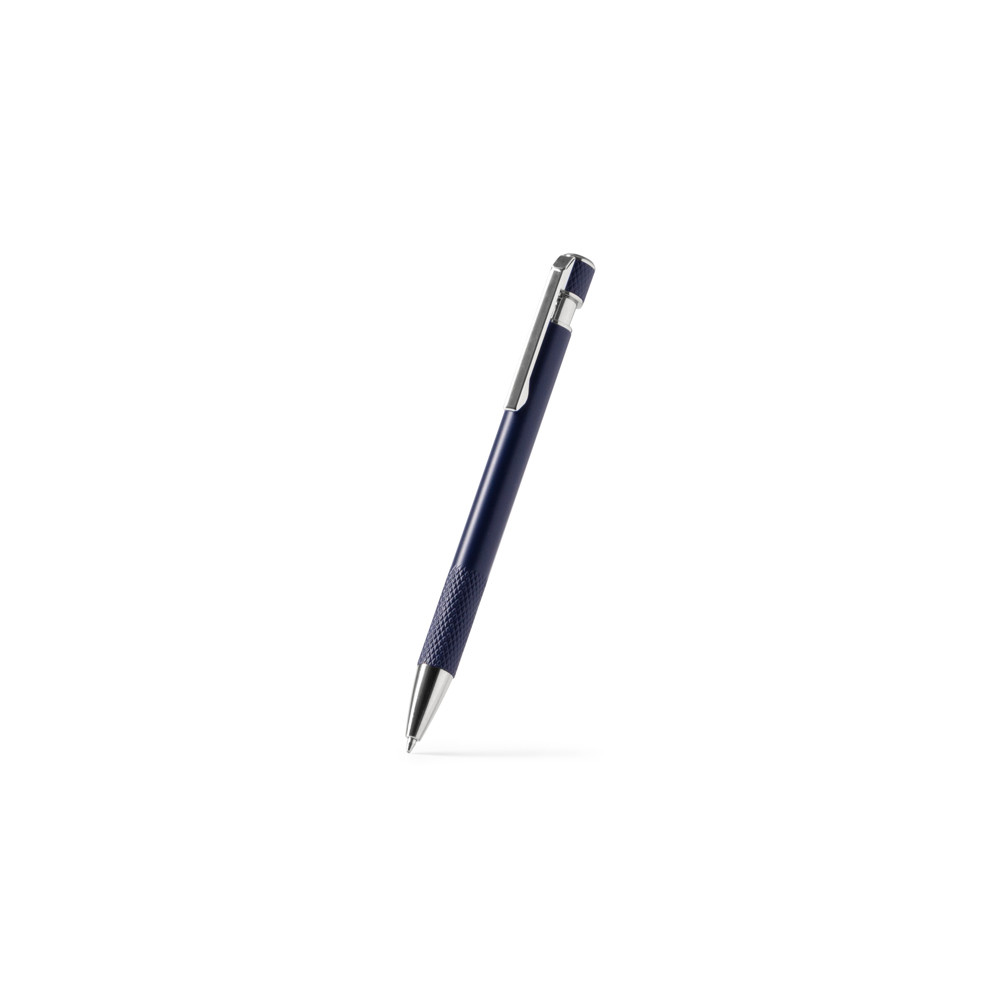 Stylo en aluminium recyclé, finition mate unie, avec des détails argentés. Texturé dans la zone de prise en main et sur le bouton. Encre bleue.Destinataire :
