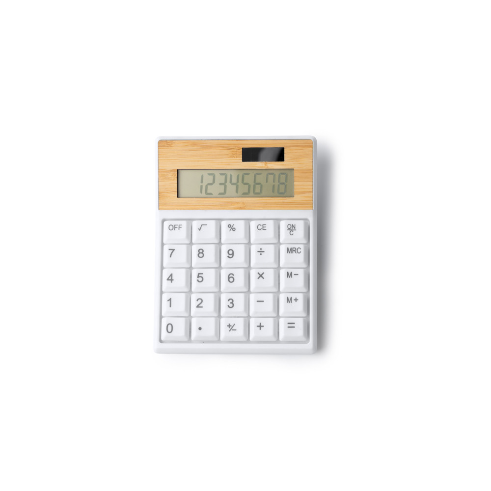 Calculateur à 8 chiffres en ABS recyclé et bambou. Fonctionne avec une pile bouton (incluse) et énergie solaire rechargeable. Présentation en boîte éco.Destinataire :