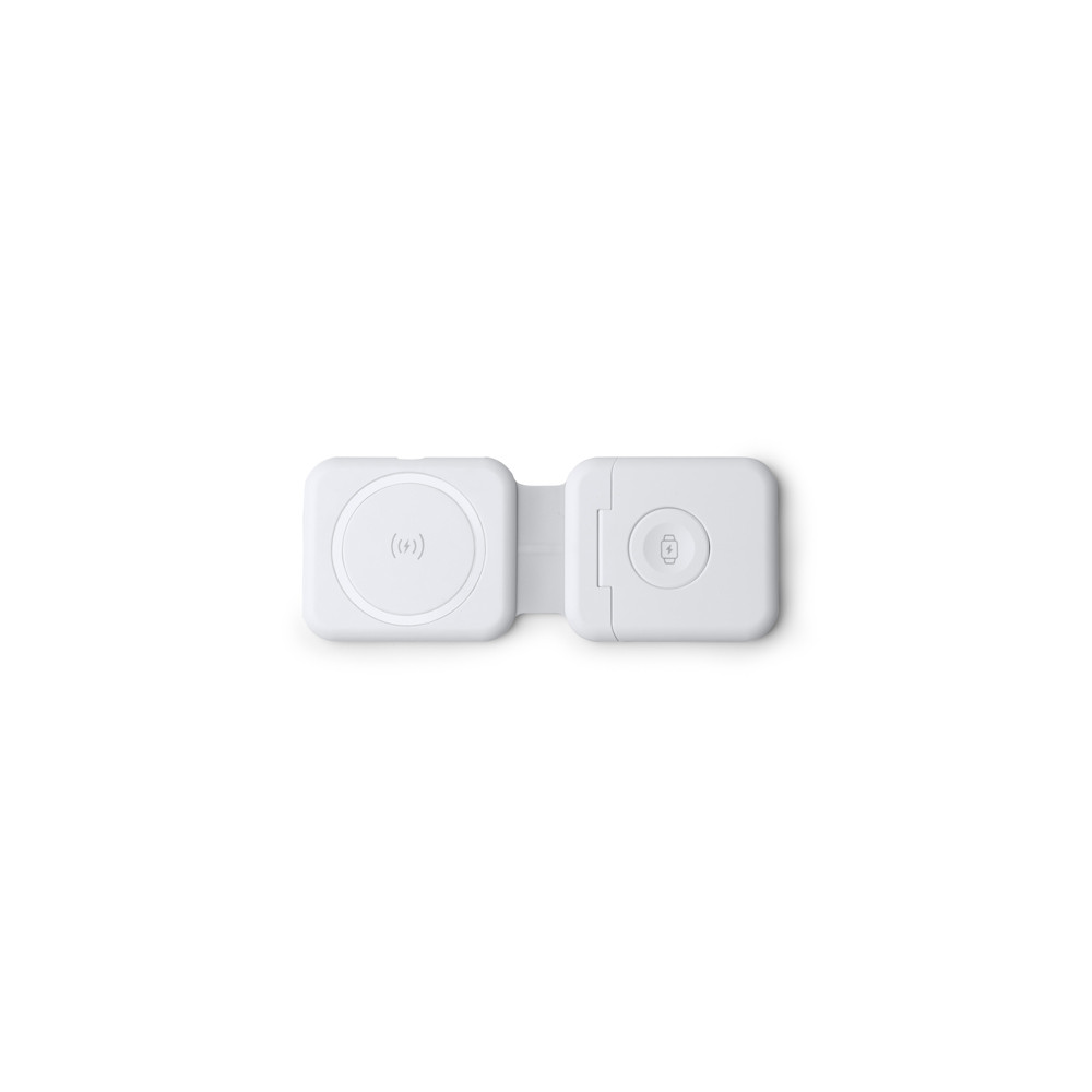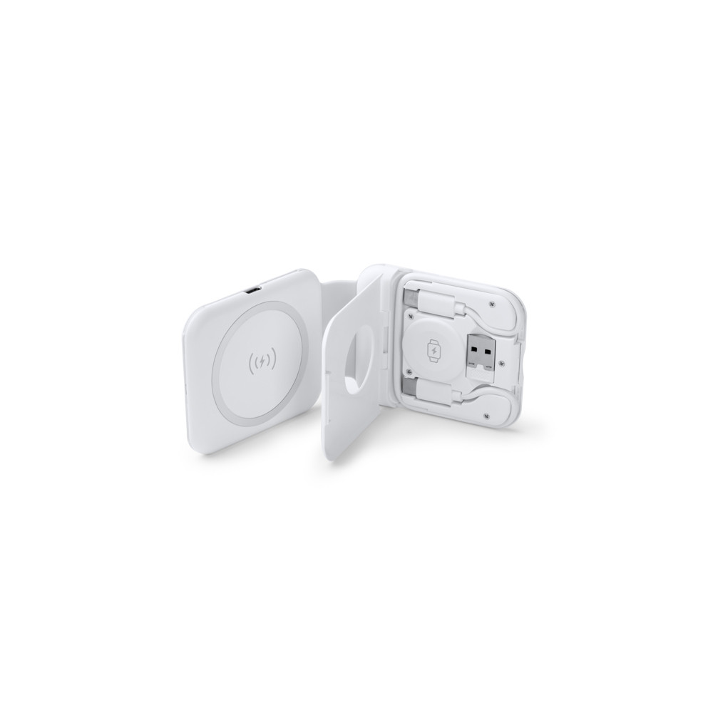 Chargeur sans fil 3 en 1 pliable avec une puissance de 15 W. Idéal pour voyager. Comprend une base pour charger les smartphones et les écouteurs sans fil, et une autre base pour charger les montres intelligentes. Comprend un câble de type USB-C et un adaptateur USB vers USB-C.Destinataire :