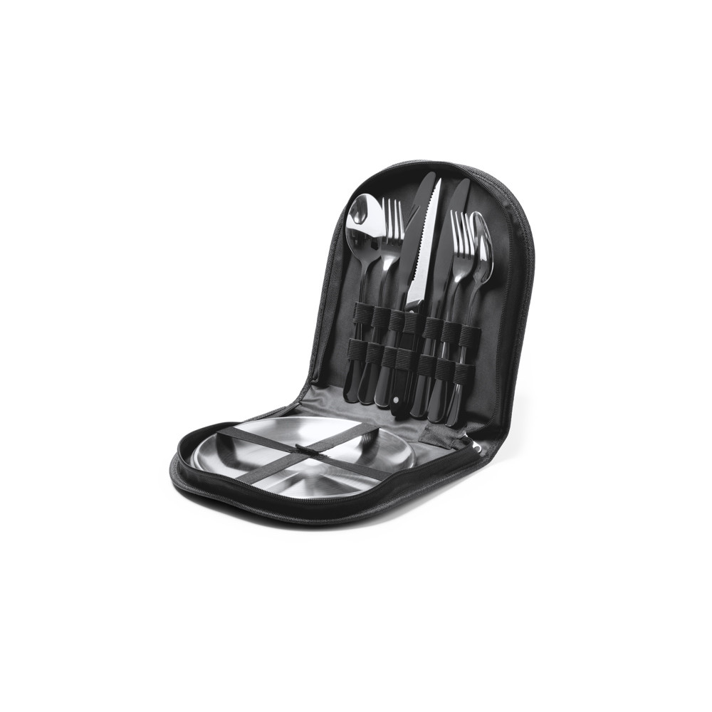 Ensemble de couverts et assiettes en acier inoxydable. Accessoires : 2 cuillères, 2 fourchettes, 2 couteaux, couteau de scie et 2 assiettes. Présentation dans un étui en RPET pour le transport avec fermeture éclair.Destinataire :