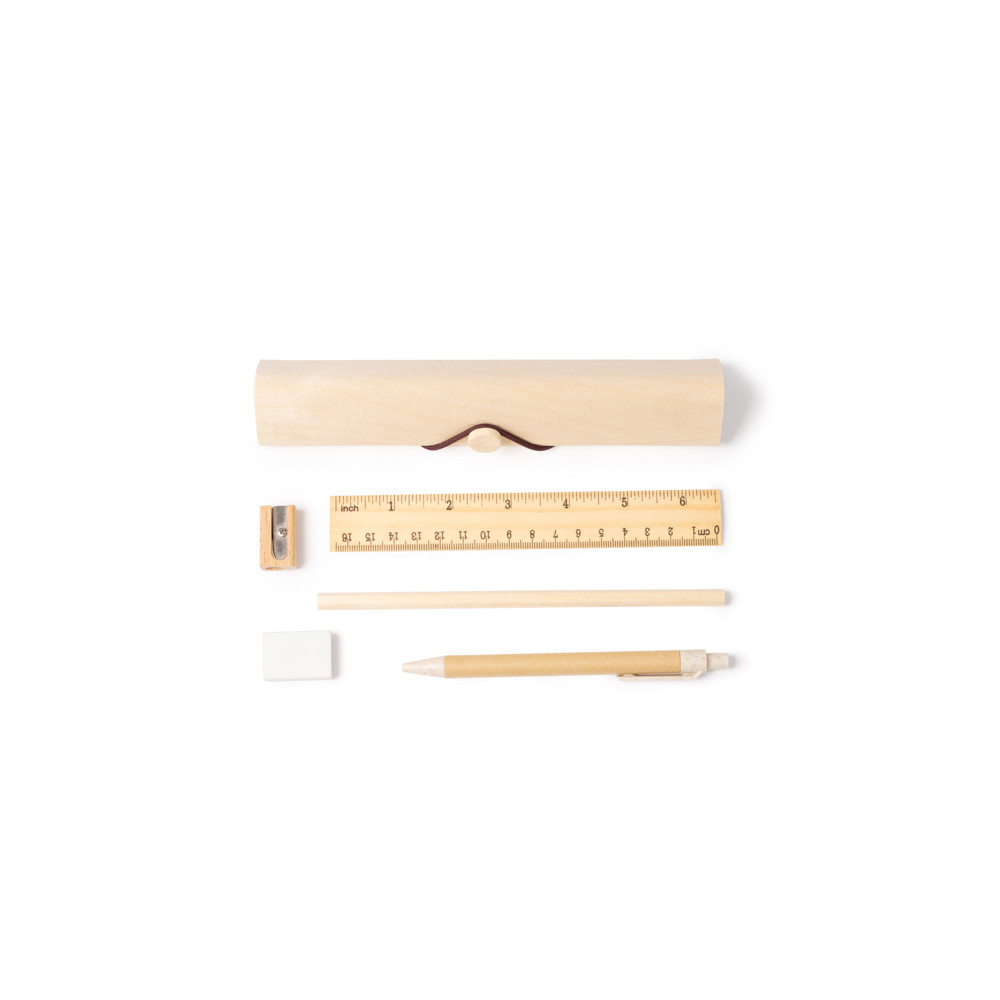 Set d'écriture en bois naturel présenté dans un coffret en bois. Comprend les 5 produits de base : règle, crayon, stylo en carton recyclé avec bouton poussoir, gomme et taille-crayon.Destinataire :