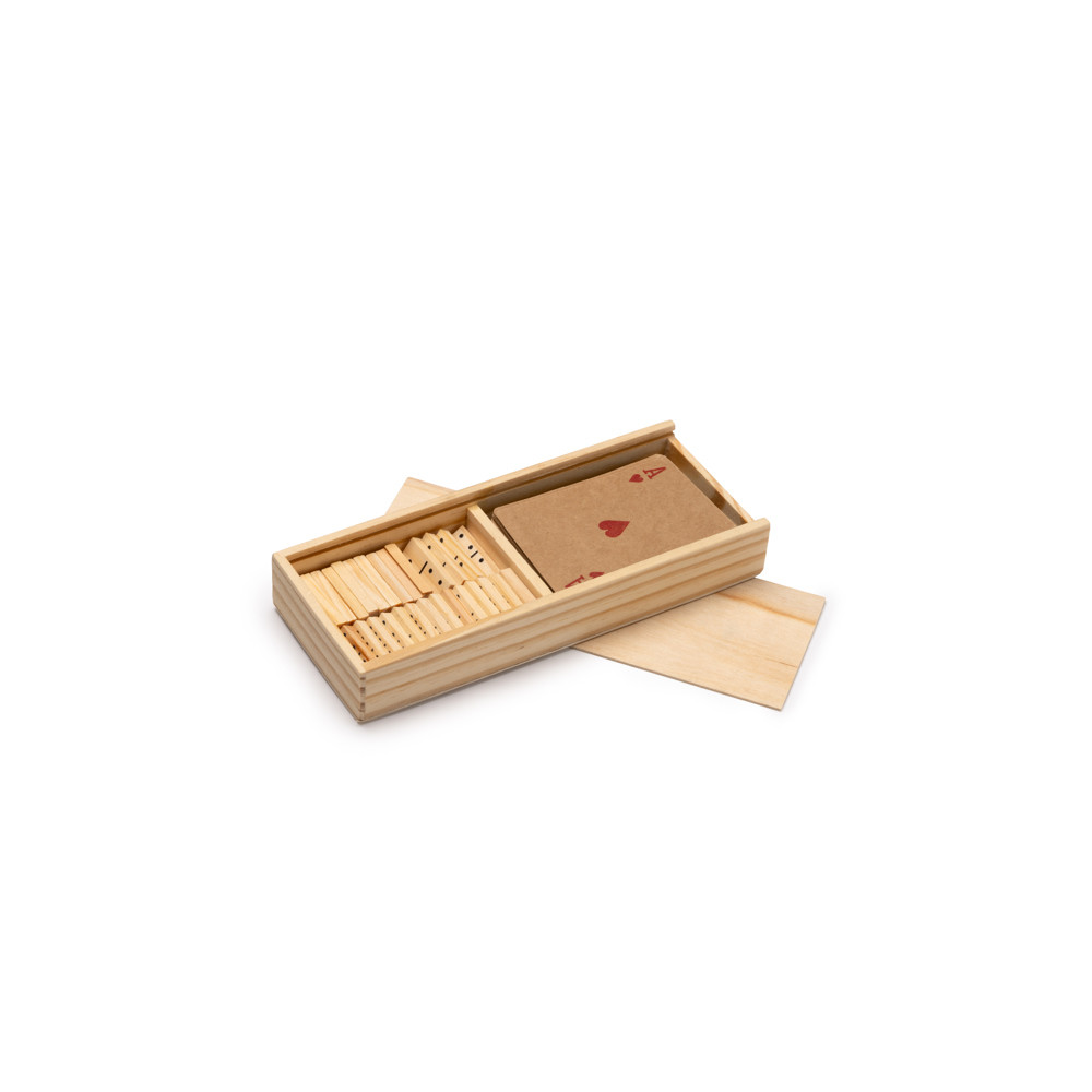 Ensemble de deux jeux comprenant un jeu de cartes en carton recyclé et un domino en bois, présentés dans une élégante boîte en bois. Idéal pour profiter des jeux classiques d'une manière durable et élégante, parfait pour offrir en cadeau ou pour un usage personnel.Destinataire :