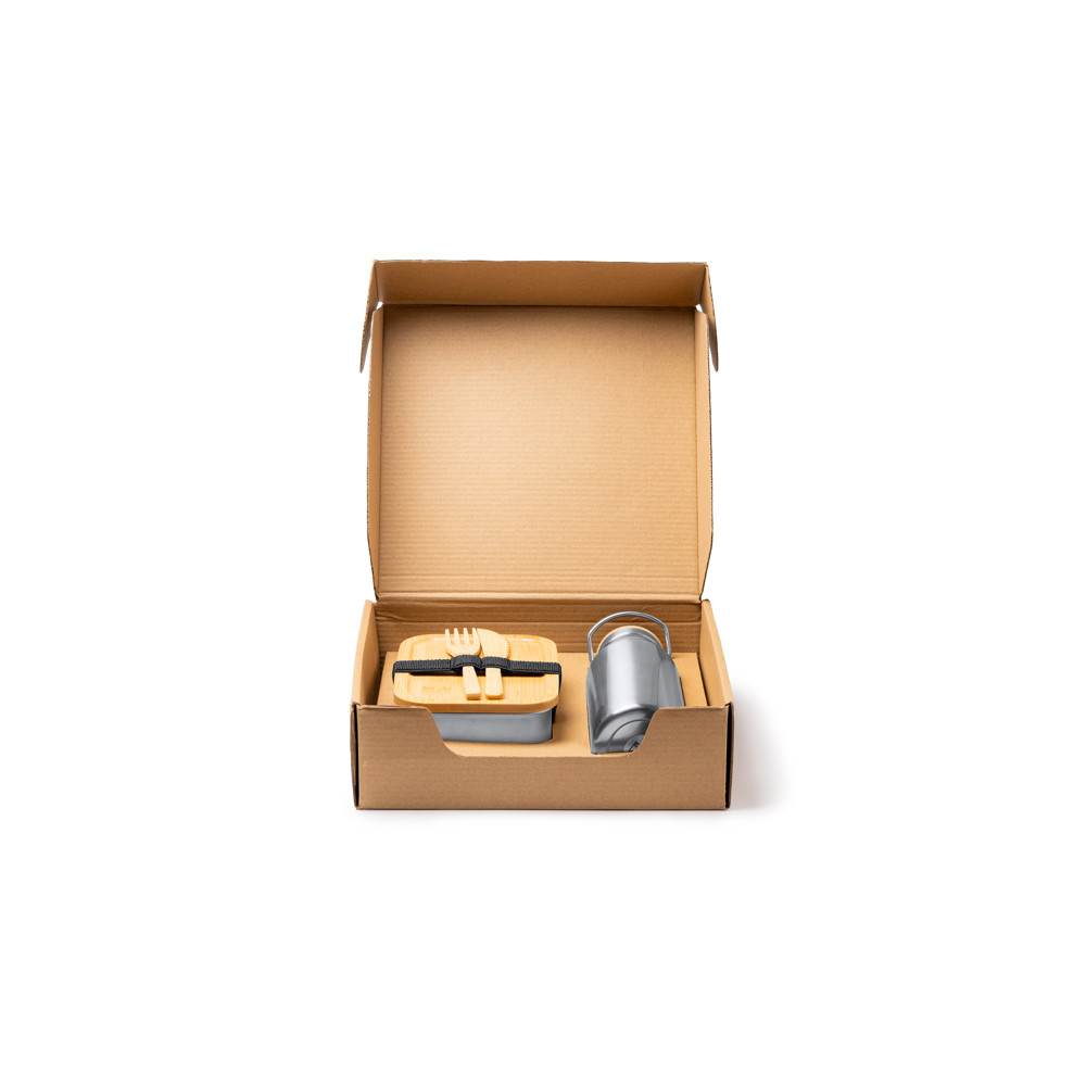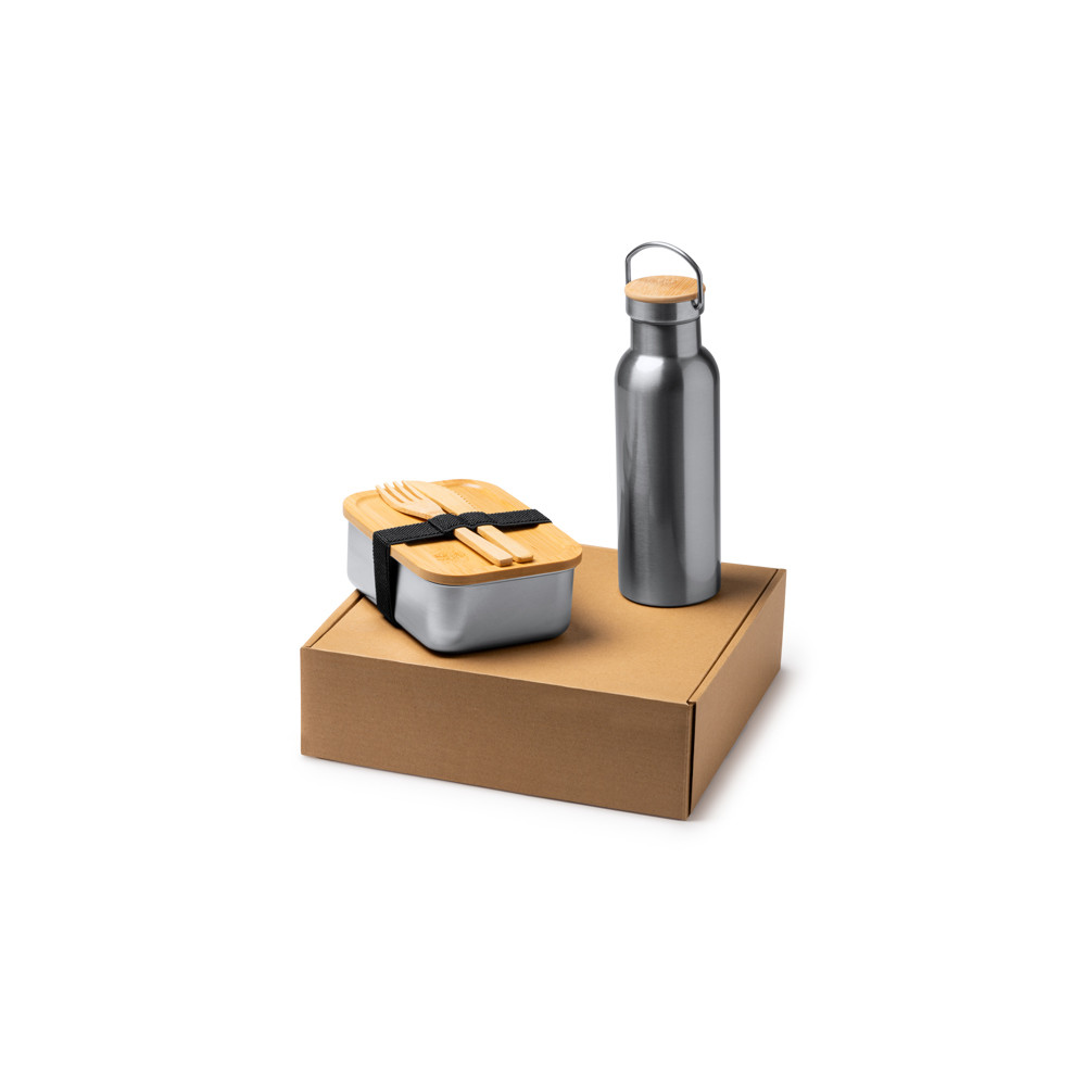 Ensemble gamelle avec couverts et bouteille. Gamelle en acier inoxydable 304, capacité de 800 ml et couvercle en bambou avec bande élastique de sécurité. Comprend un ensemble de couverts en bambou. Bouteille en acier inoxydable 304, capacité de 500 ml. Présentation en boîte éco-conception.Destinataire :