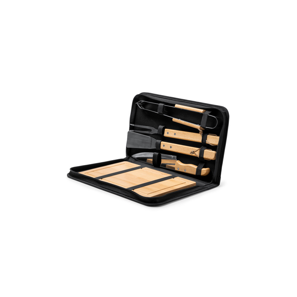 Ensemble de barbecue. Comprend 4 accessoires en acier inoxydable avec manche en bois : couteau, couteau à trancher, pinces, spatule et planche à découper en bois. Présenté dans un boîtier en polyester RPET recyclé.Destinataire :