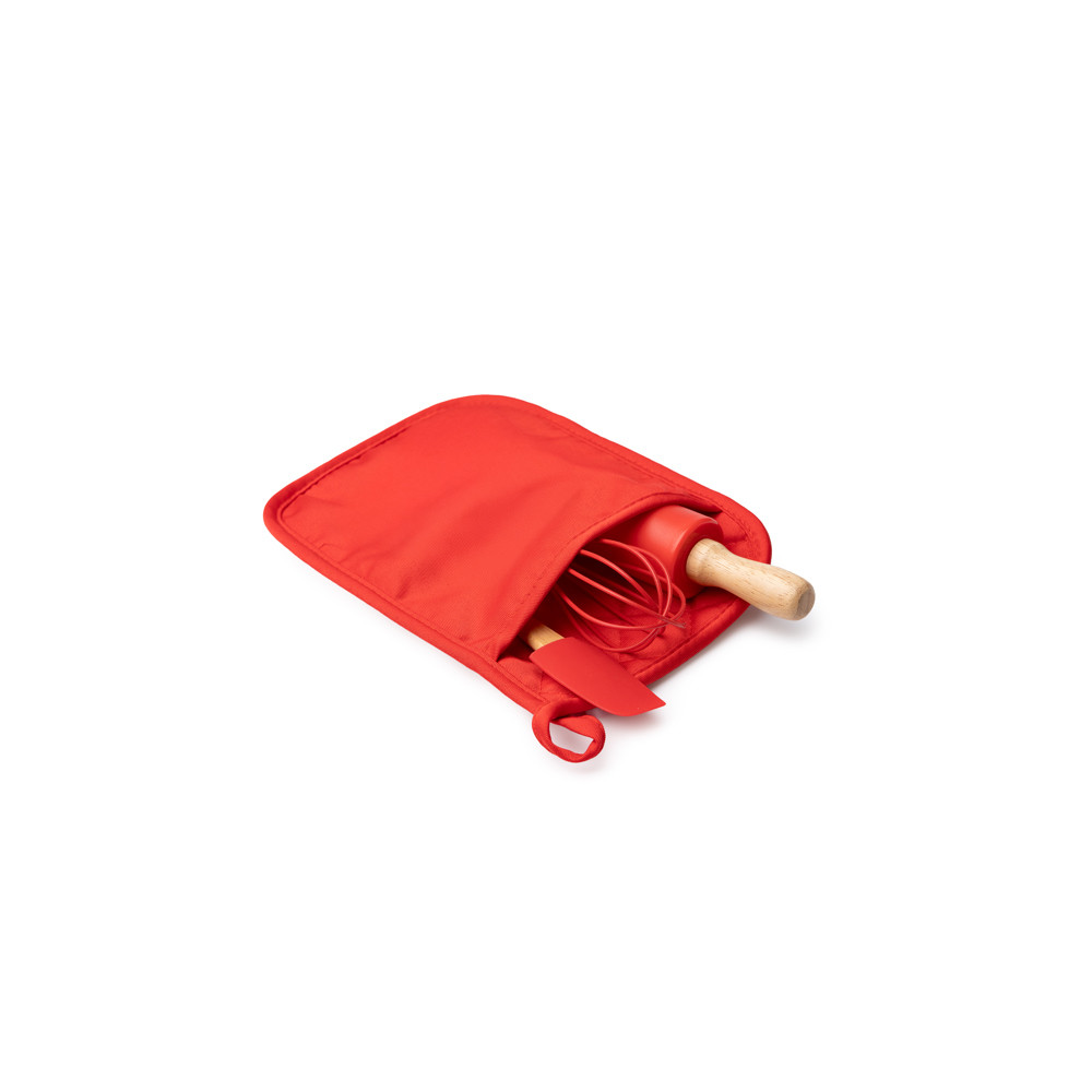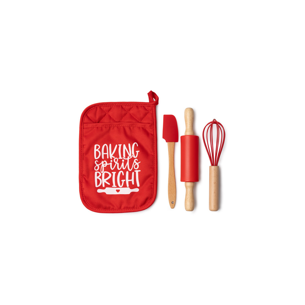 Ensemble d'ustensiles de cuisine pour la création des biscuits maison. Comprend un rouleau, un fouet et une spatule avec un design de Noël. Avec une pochette polyvalente pour tout ranger.Destinataire :
