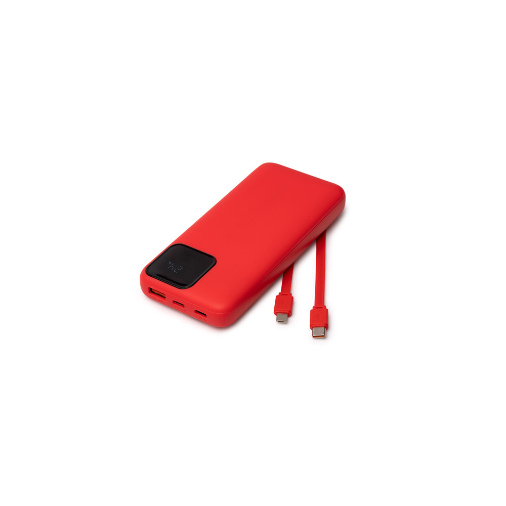 Batterie externe de 10 000 mAh et charge rapide de 20 W, avec corps en ABS recyclé doux au toucher. Comprend un écran avec indicateur de charge. Sorties de type USB-C et USB. En outre, elle comprend un câble intégré de type USB-C et Lightning.Destinataire :