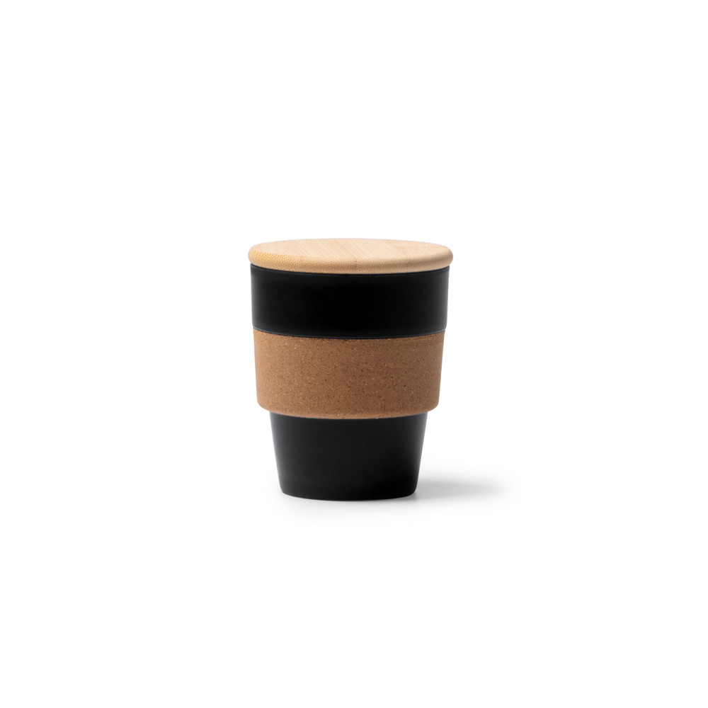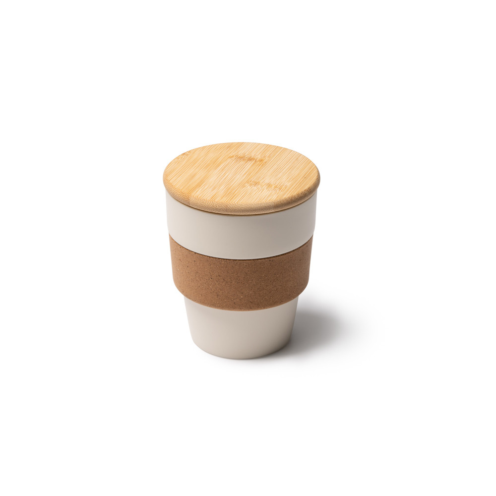Tasse de corps en PP recyclé, bande de liège et couvercle en bambou. Capacité : 350 ml. Présentation en boîte éco-conception.Destinataire :