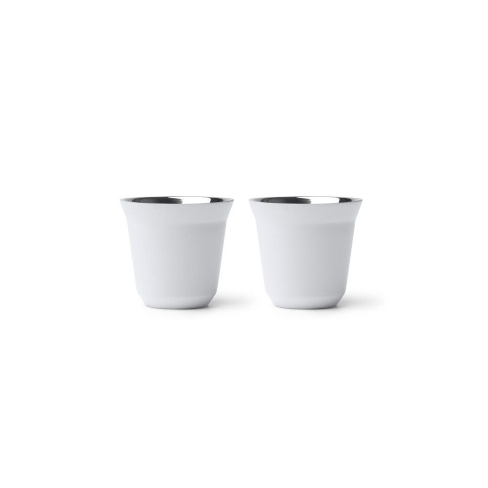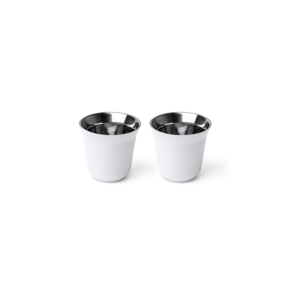 Ensemble de 2 tasses à café en acier inoxydable 304 recyclé, avec corps en finition mate et effet miroir à l'intérieur. Capacité de 80 ml chacun.Destinataire :