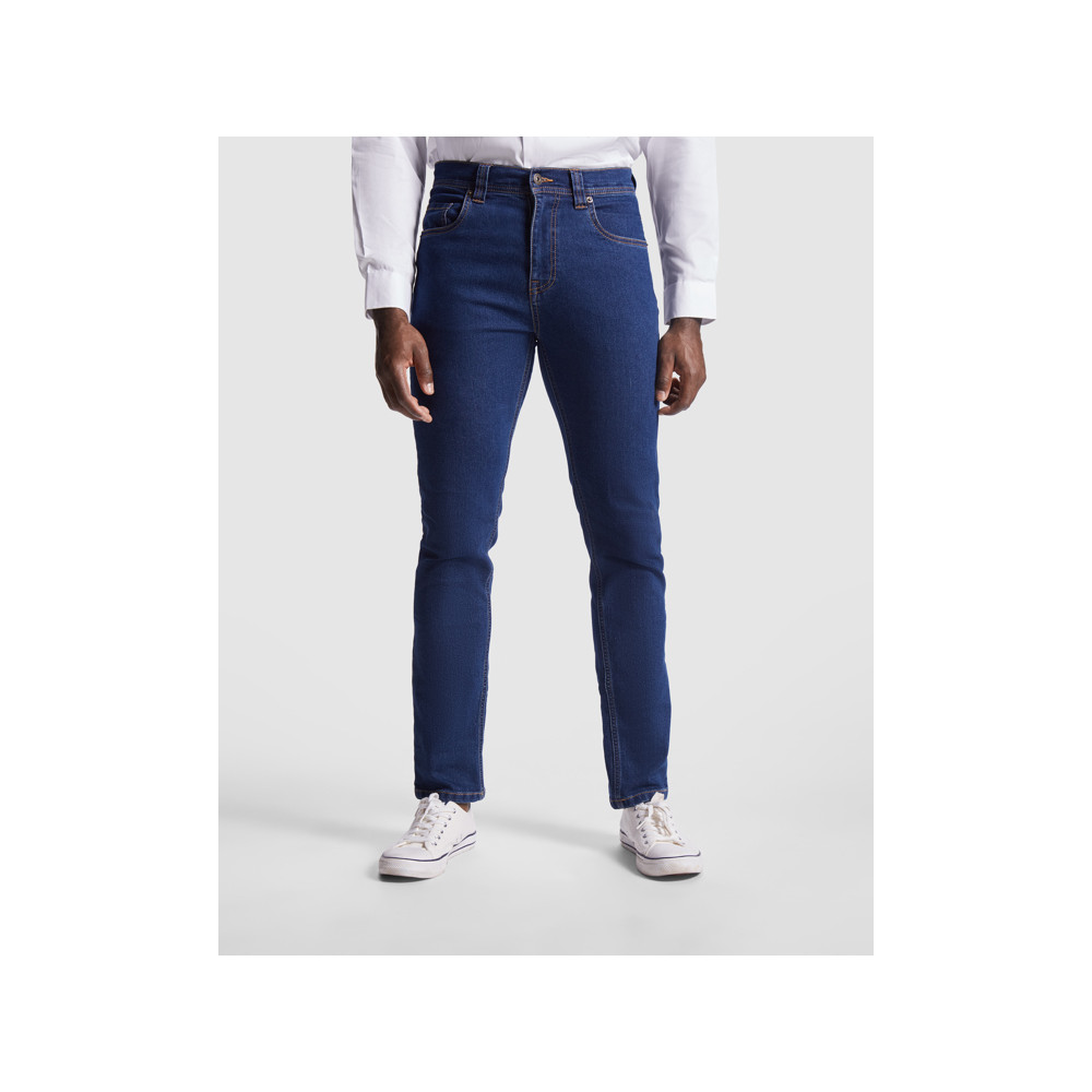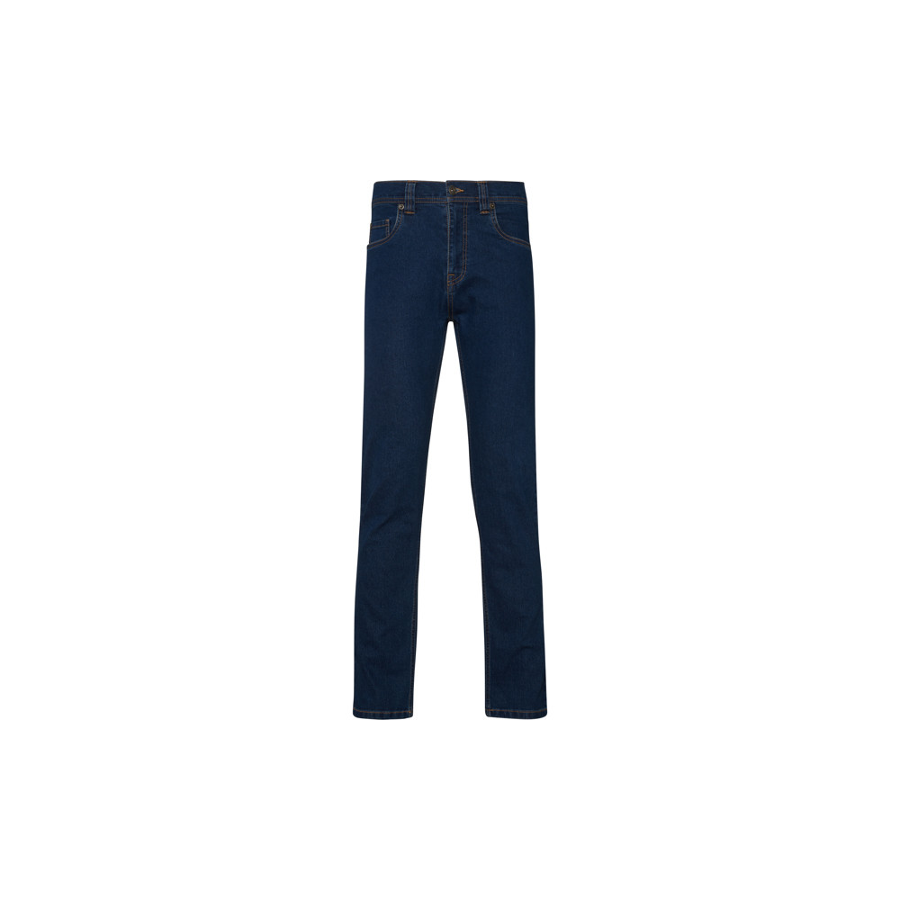 Jeans pour hommes. · Coupe régulière et taille mi-haute. · Ceinture à 5 passants.· Braguette avec une fermeture éclair en métal.· Deux poches avant et une poche à monnaie.· Deux poches arrière.· Coupe semi-ajustée en tissu élastique.