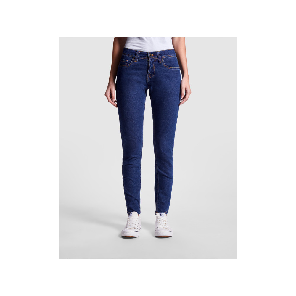 Jeans pour femmes. · Coupe régulière et taille mi-haute. · Ceinture à 5 passants.· Braguette avec une fermeture éclair en métal.· Deux poches avant et une poche à monnaie.· Deux poches arrière.· Coupe semi-ajustée en tissu élastique.