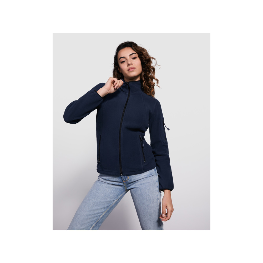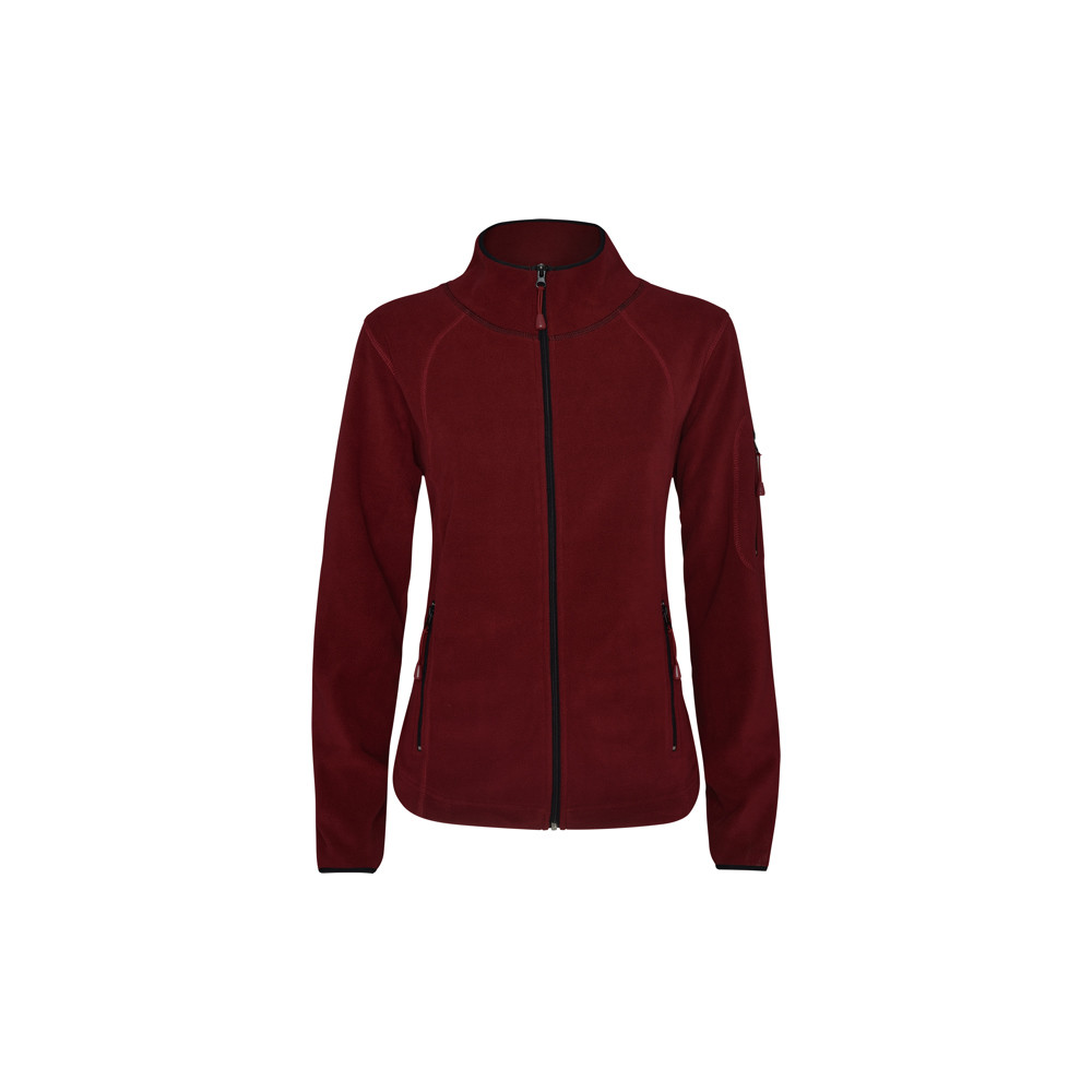 Veste polaire femme pour le sport , col montant et manches longues avec liseré contrasté. Zip central. Poche avec zip sur la manche gauche et zip central, tous deux contrastés. Coutures latérales et poitrine. Coudières ton sur ton.