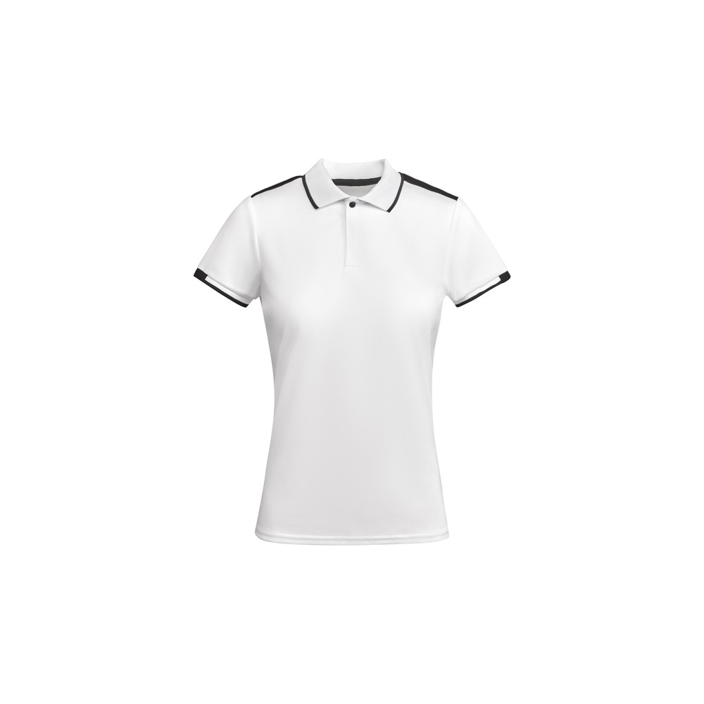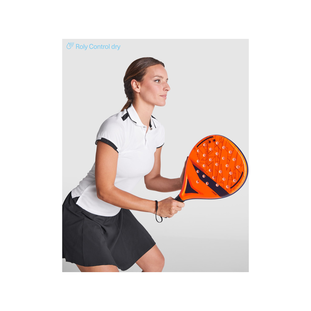 Polo technique ajusté à manches courtes pour femme en polyester recyclé antibactérien. Finitions sur les manches et col en côte 1x1. Coutures renforcées couvertes au col. Patte de boutonnage avec 2 boutons fermoirs et bouton inférieur dissimulé. Finitions et épaules contrastées. Fentes latérales sur l'ourlet.