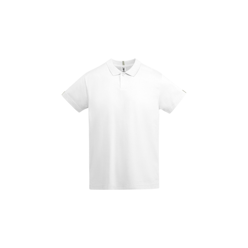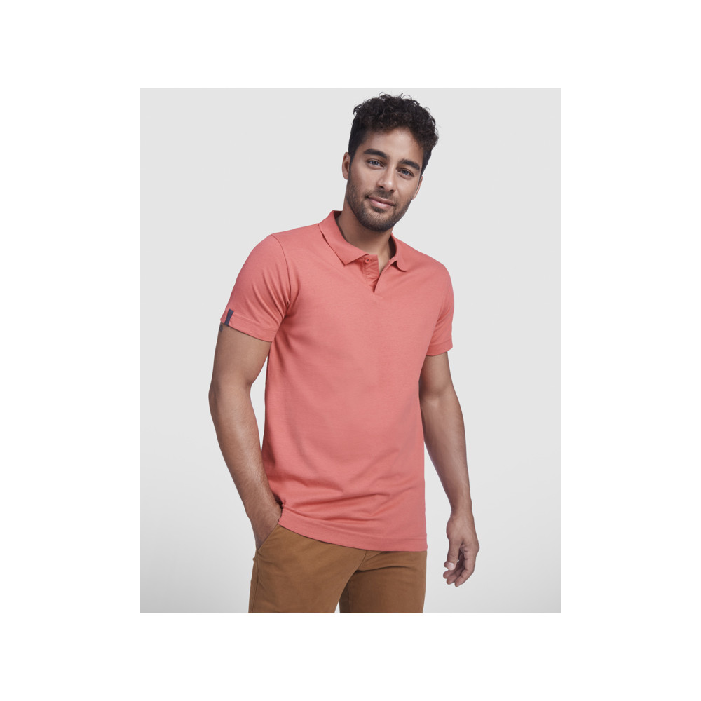 Polo à manches courtes en jersey simple. Col et manches en côte 1x1. Patte de boutonnage à 1 bouton. Coutures renforcées couvertes au col. Fentes latérales sur l'ourlet. Bande de couleur contrastante en chevron aux poignets et au col. Logo Roly assorti sur le tissu intérieur.
