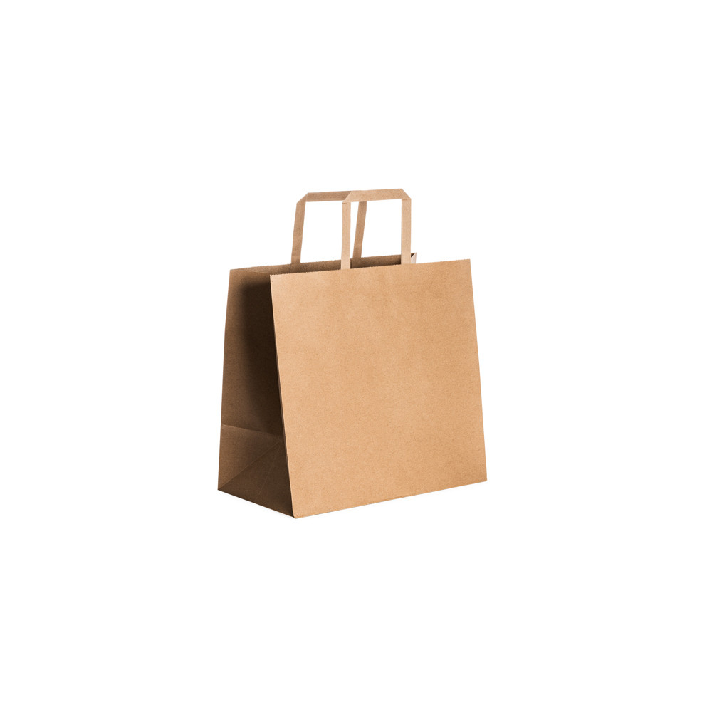 Sac papier 80 g/m² en finition naturelle. Poignées plates courtes renforcées. Idéal pour les hôtels et restaurants (à emporter).Destinataire :