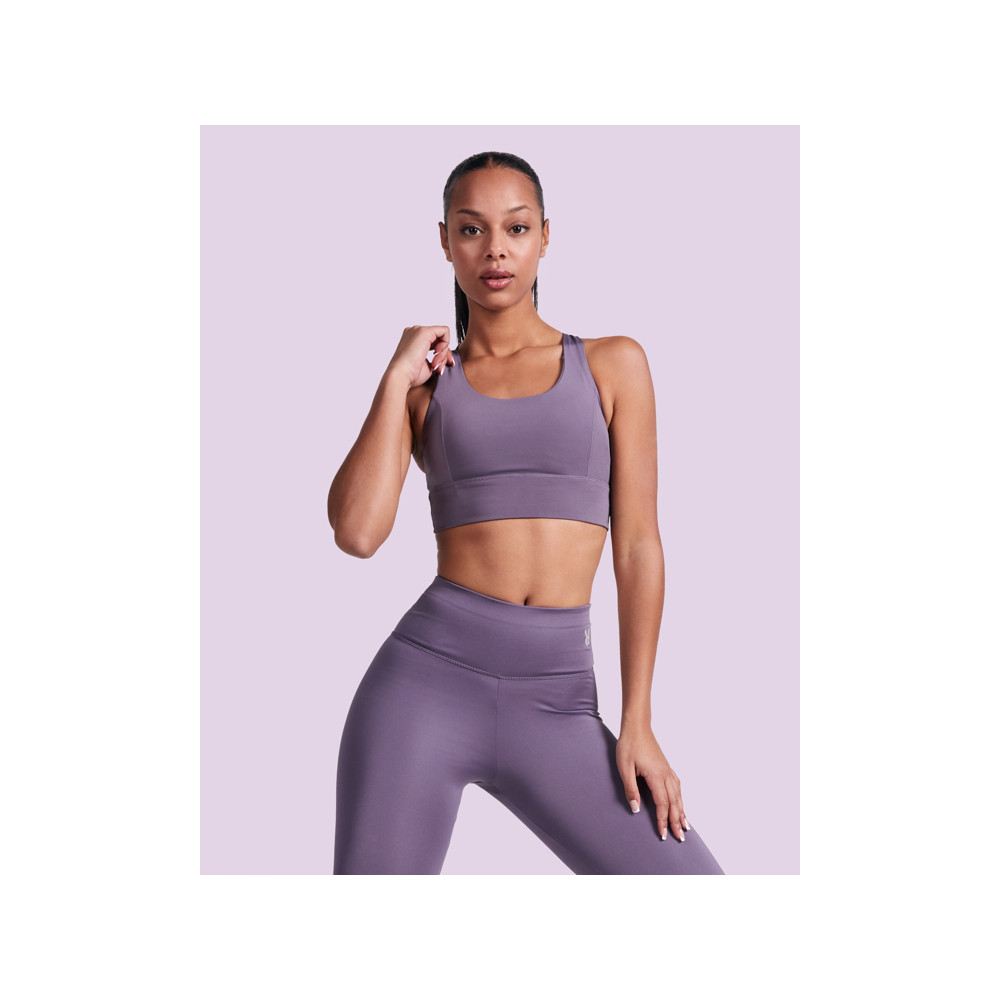 Haut de sport à fort maintien pour femme. Bretelles dos nageur. Bande élastique renforcée sous la poitrine. Tissu double et doublure. Bonnets amovibles en mousse. Logo Roly haute visibilité au dos.