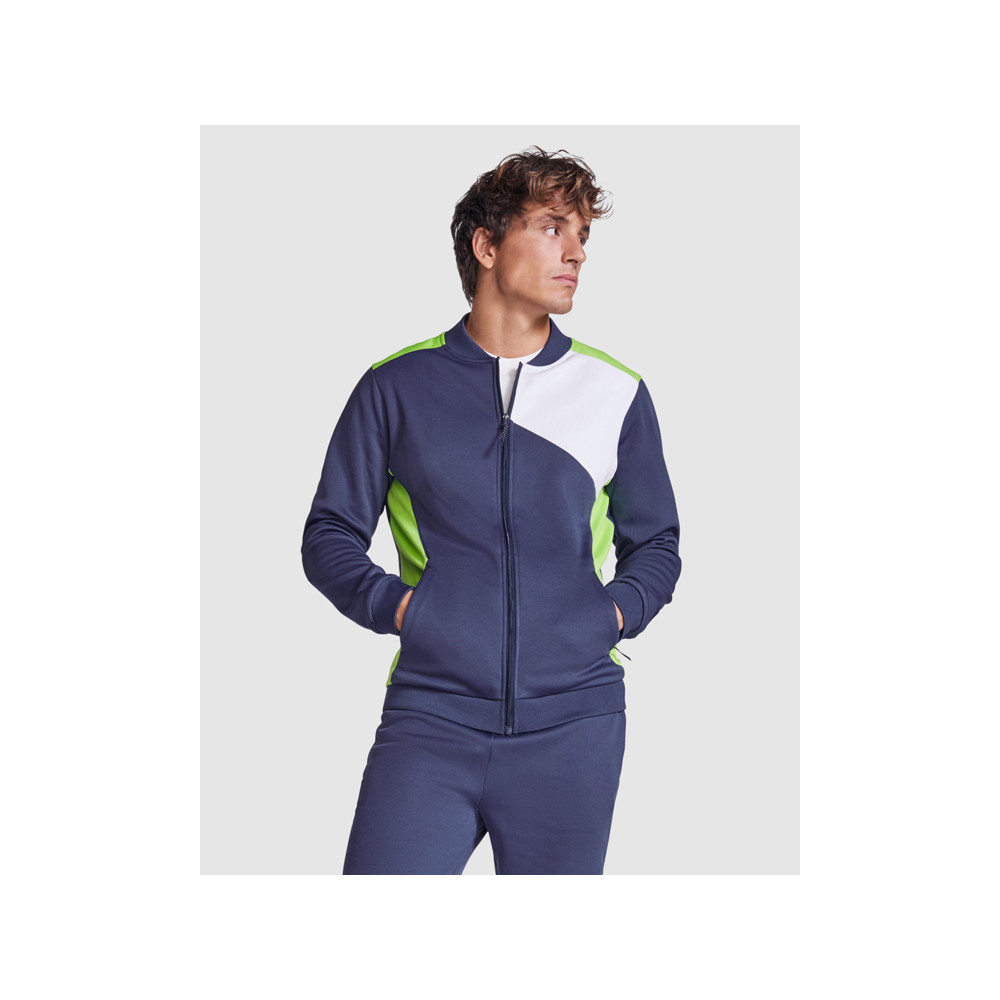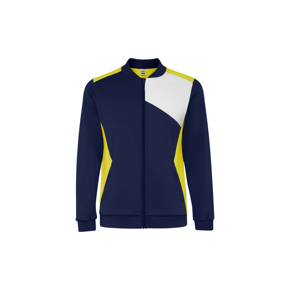 Veste de sport avec fermeture à glissière brossée sur le devant. Poches latérales avec fermeture à glissière. Pièces de couleur contrastée, une blanche sur la poitrine, spécialement conçue pour la broderie. Col, poignets et taille côtelés 1x1.
