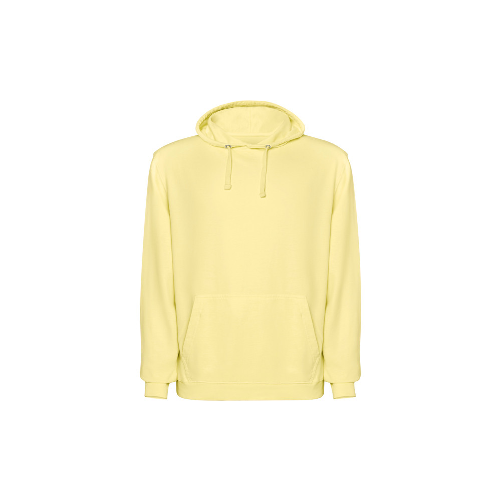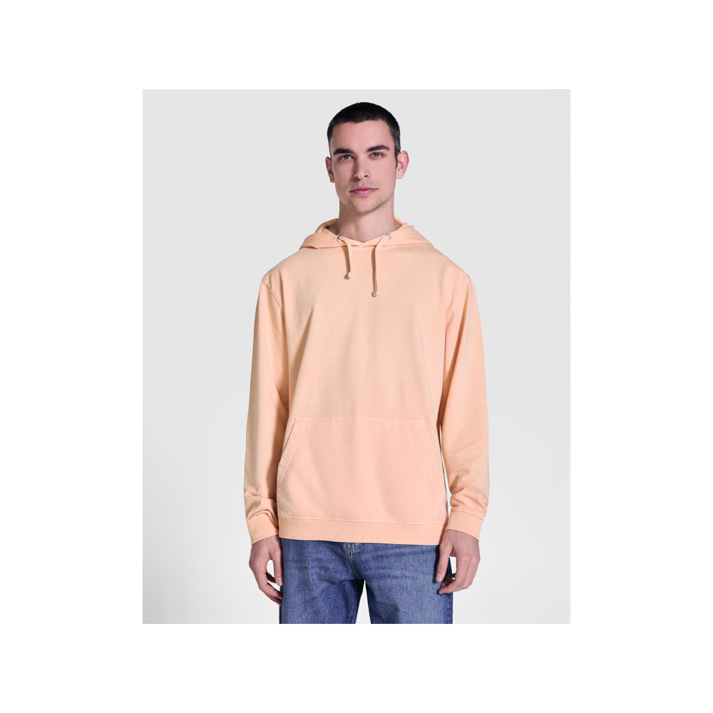 Sweatshirt à capuche unisexe en coton non gratté avec effet délavé. Poche kangourou. Poignets et taille côtelés 2x1 avec élasthanne. Cordon de serrage plat ton sur ton avec illets en métal. Coutures bordées de tissu assorti.