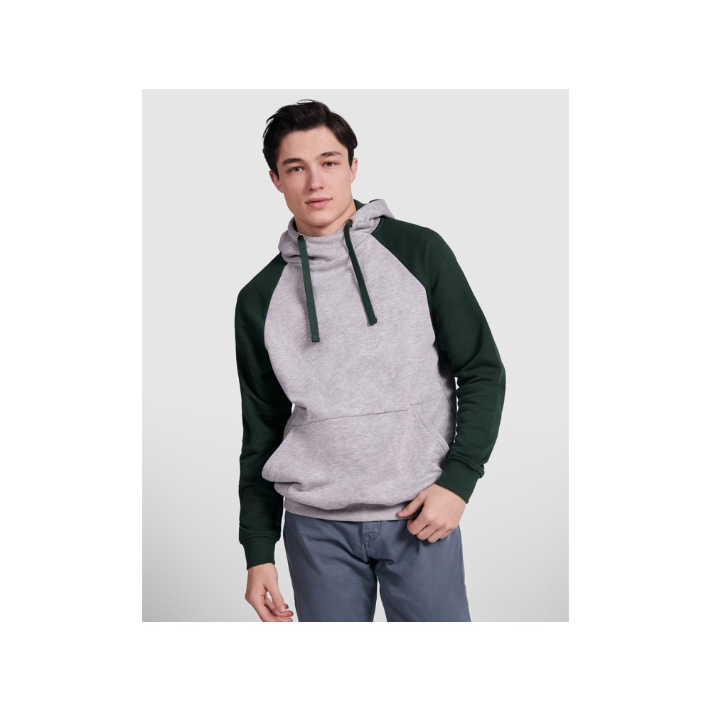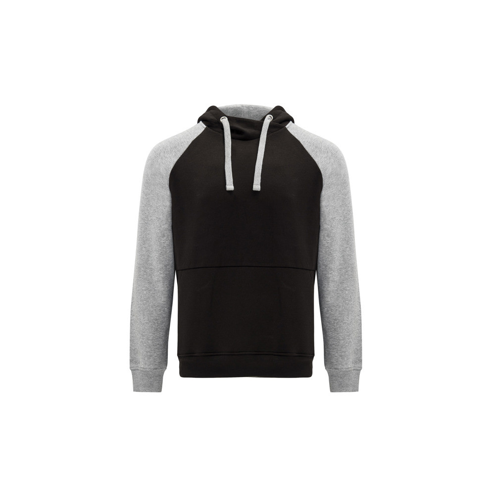 Sweat-shirt bi couleur unisexe. Capuche avec col croisé et oeillets métallique, intérieur et cordons contrastés. Manches raglan contrastées. Poche kangourou. Poignets et bas en côte avec élasthanne 1x1.