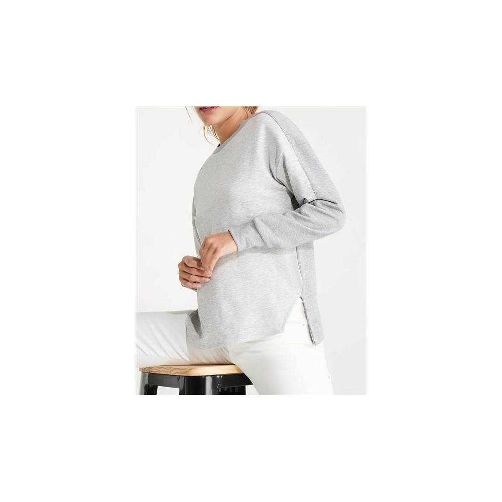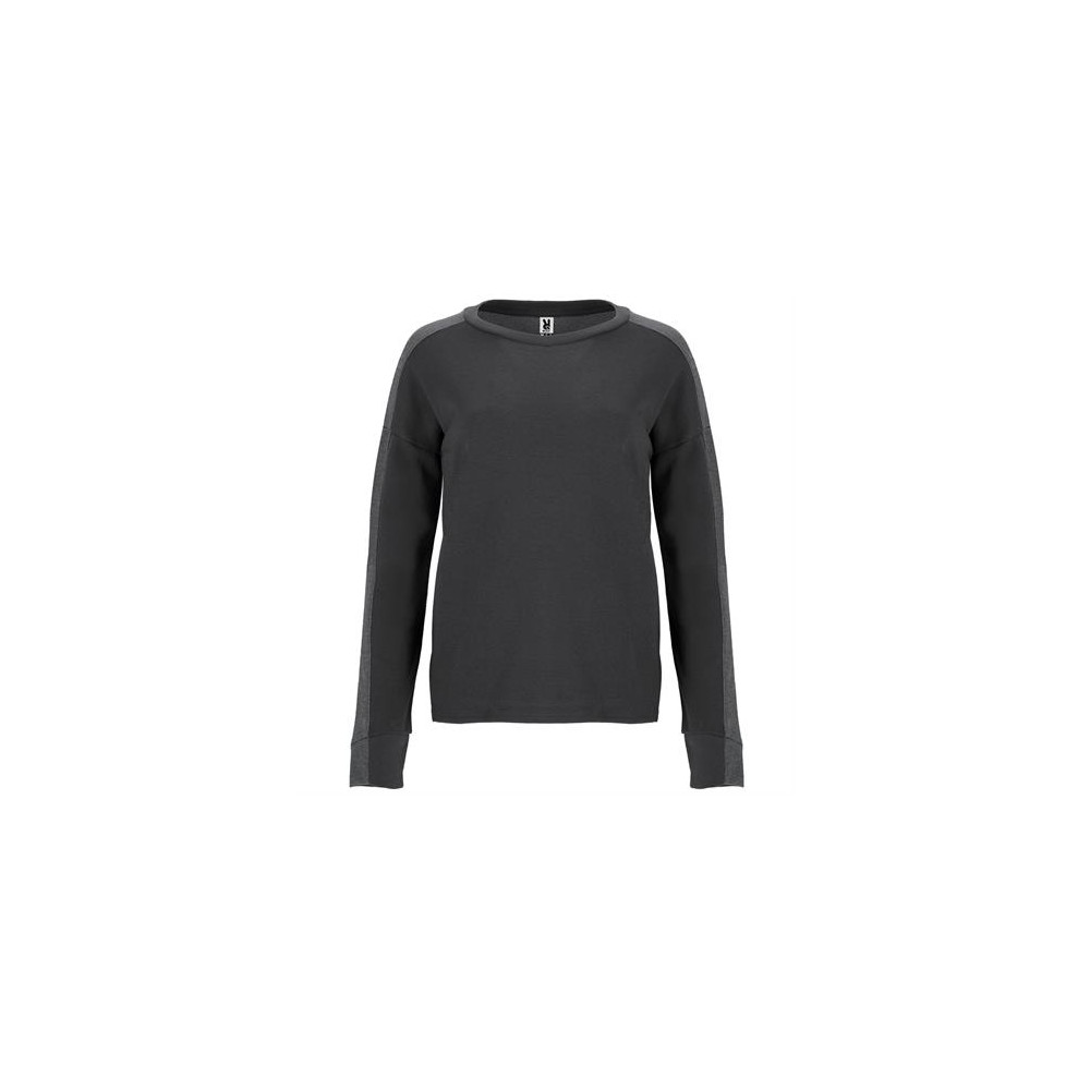 Sweat-shirt pour femme, combiné avec deux tissus et deux couleurs. Col, demi poignet et bas du dos en côte 2x1. Poignets coupe asymétrique. Bas avec ouvertures latérales et dos plus long que le devant.