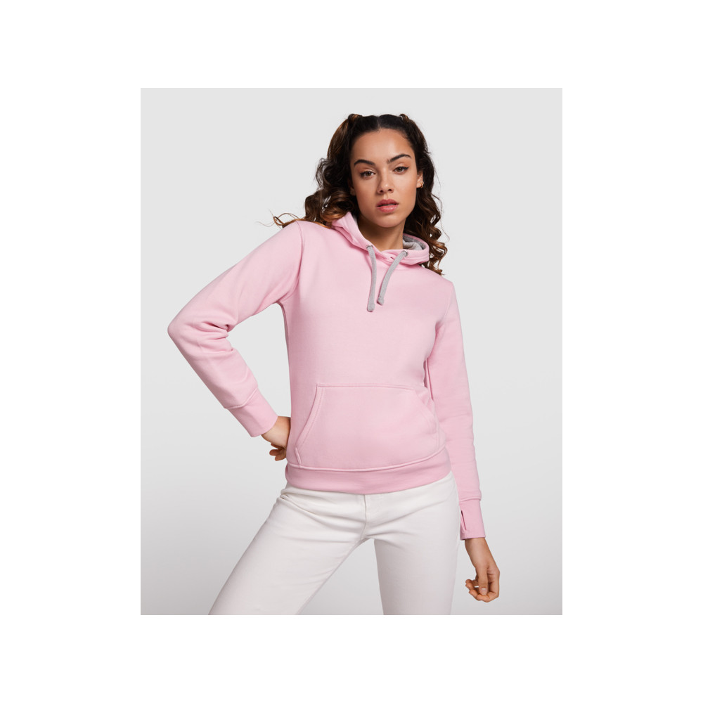 Sweat-shirt coupe près de corps féminin avec capuche doublé à contraste et au ton du cordon de serrage et poche kangourou. Bande de propreté renforcée en tissu chevron pour l'encolure. Poignets et ceinture cotê 1x1 avec élasthanne. Detaille thumb slit – poignet avec ouverture de boutonnière pour le pouce.