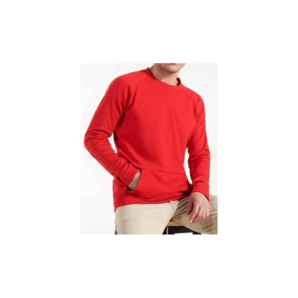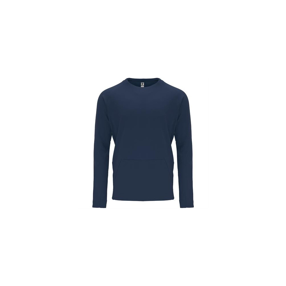Sweat manches longues style raglan. Arrière du col et poignets en côte 1x1. Poche kangourou avec finition sans coutures. Coutures latérales en diagonales allant sur la partie frontal du sweat.