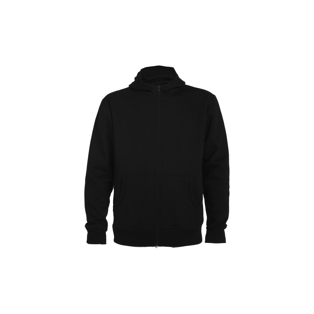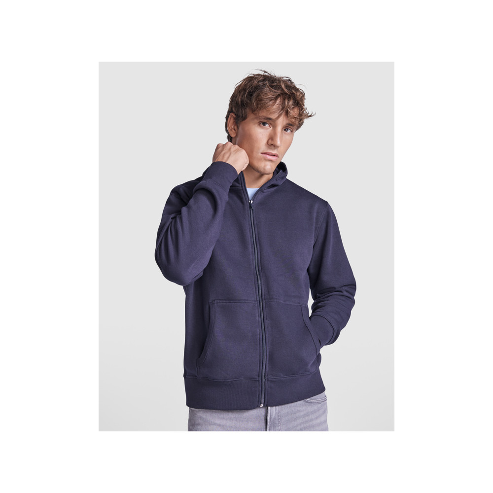 Sweat-shirt capuche décontracté avec fermeture éclair. Finition côte sur le contour de la capuche et des poches. Poche kangourou. Poignets et ceinture en côte 2x2 avec élasthanne.