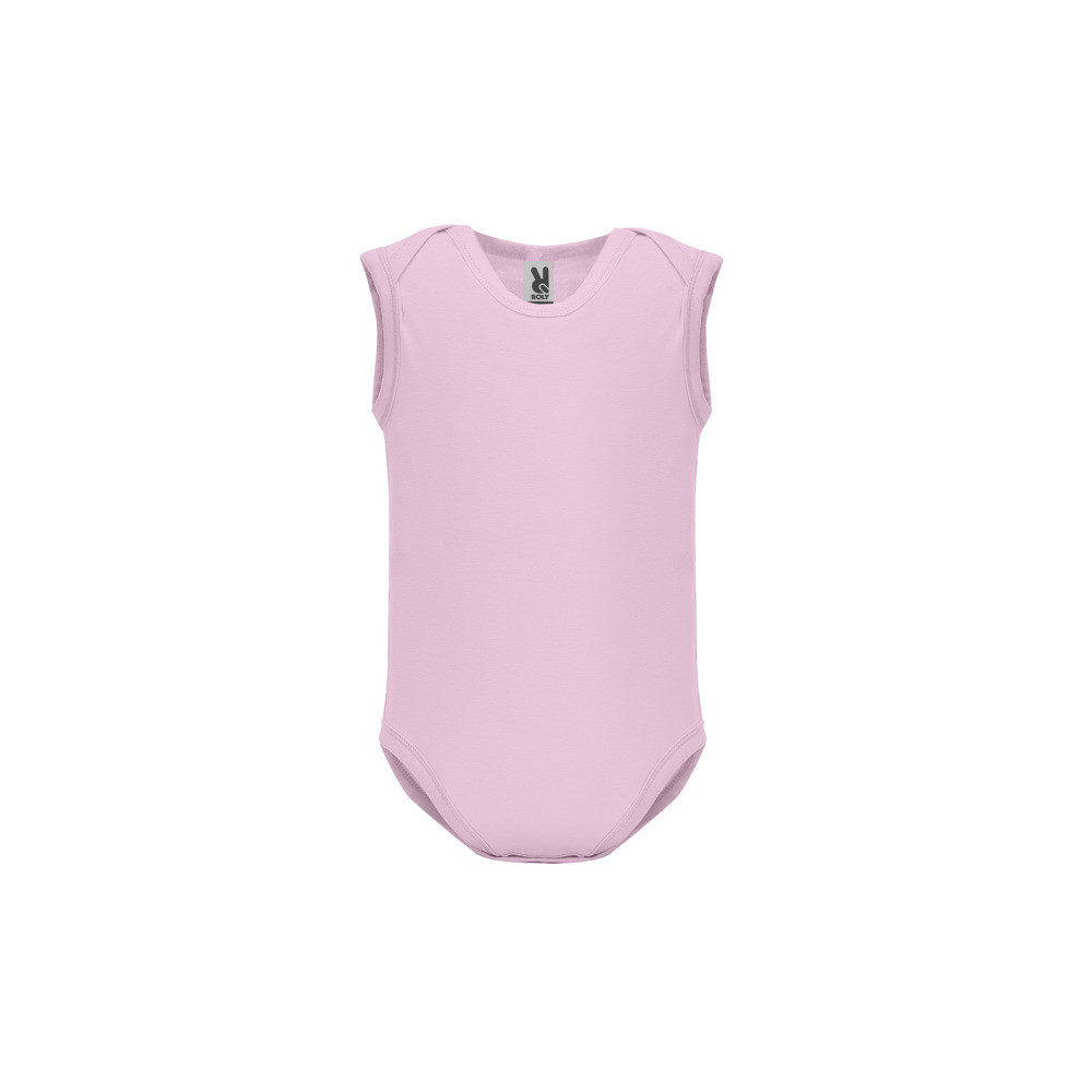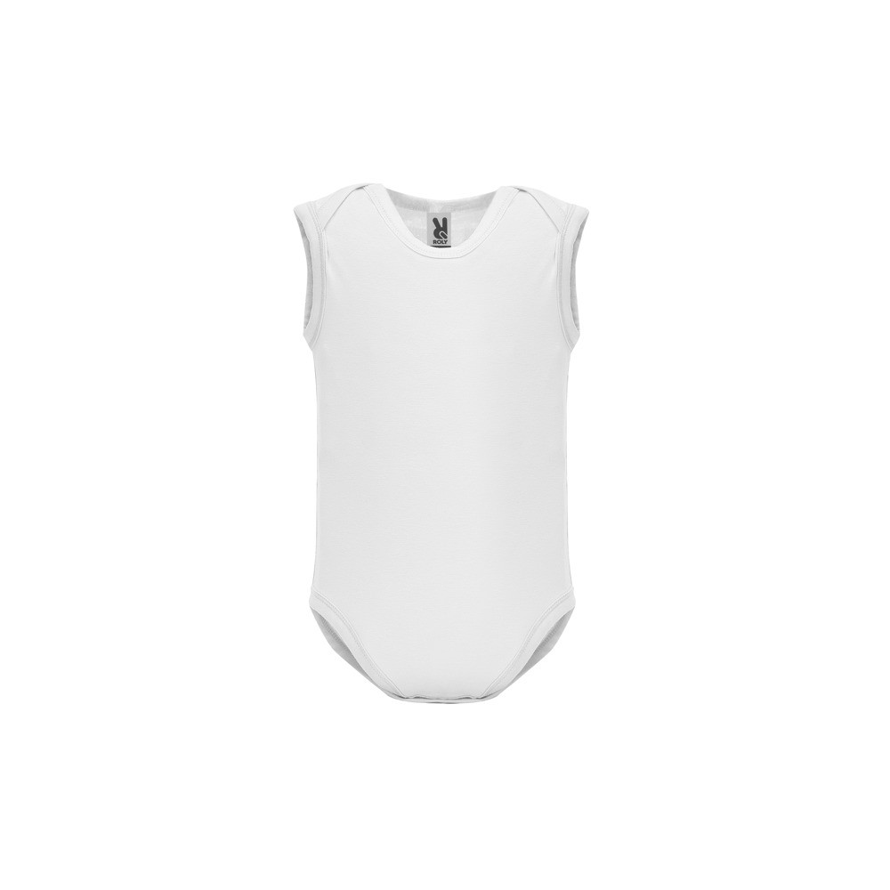 Body bébé sans manches en maille single jersey. Col rond, enmanchures et bas en côte 1x1. Fermeture par bouton à pression à l'entrejambe. Ouverture croisé à l'épaule.