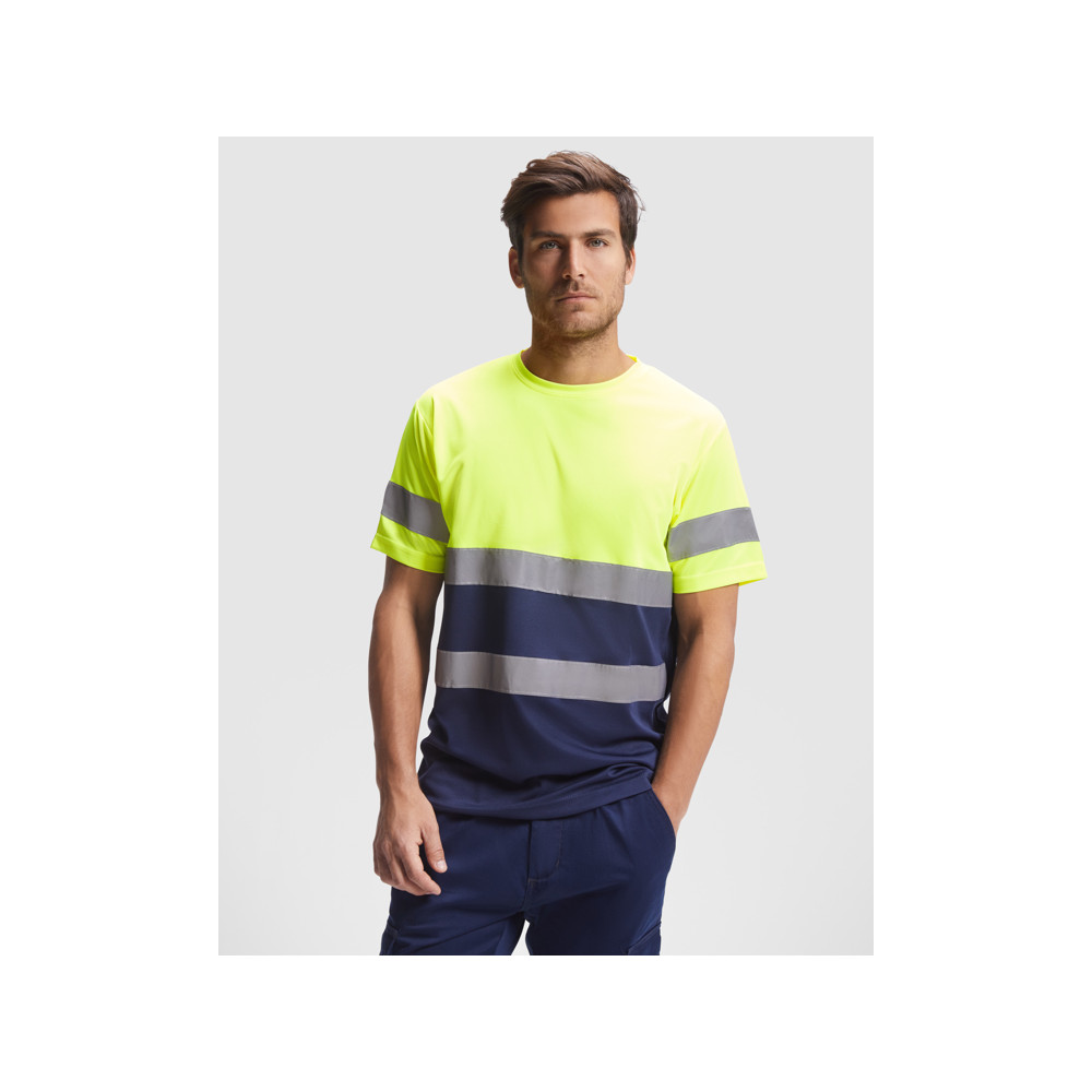 T-shirt technique manches courtes haute visibilité. Col rond avec le même tissu et bande de propreté renforcée à l'intérieur du col. Deux bandes réfléchissantes horizontales sur le torse et une sur les manches.
