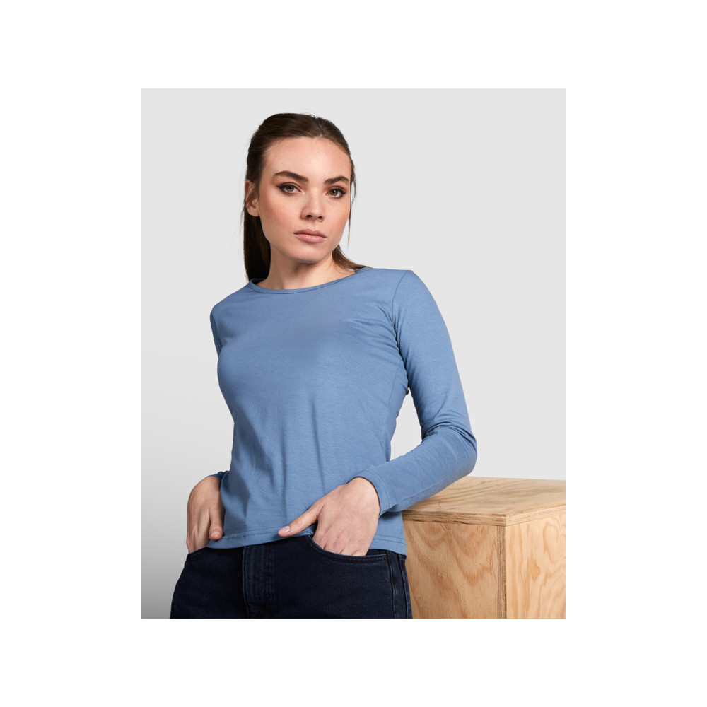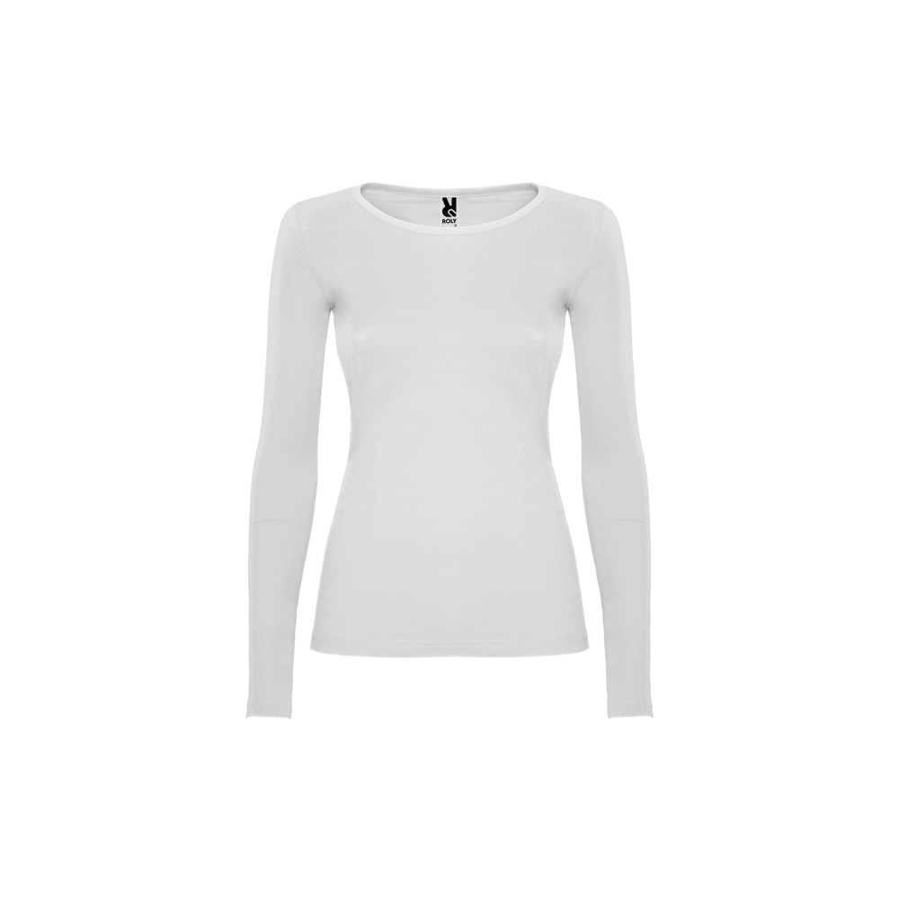 T-shirt coupe semi-ajustée, manches longues et col achevée avec liseré fin. Sans poignets. Coutures latérales.