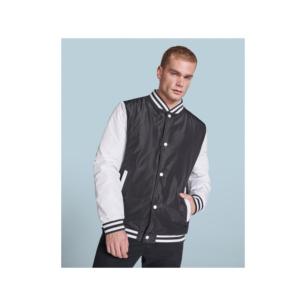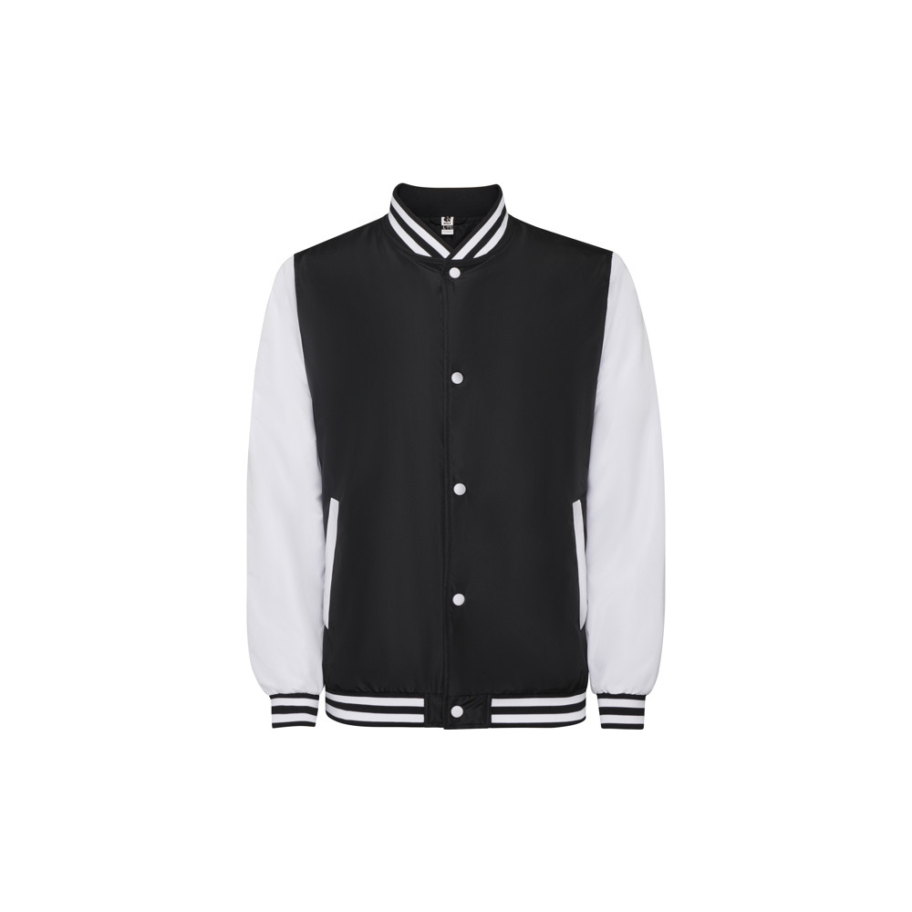 Veste unisexe en bicolore. Légèrement rembourrée. Poches latérales avec fermeture à glissière et bordure en tissu contrastant. Col, poignets et ourlet côtelés 1x1 avec lignes contrastées associées au corps. Boutons-pression avec finition en plastique contrastée. Accès à l'arrière pour retraitement.