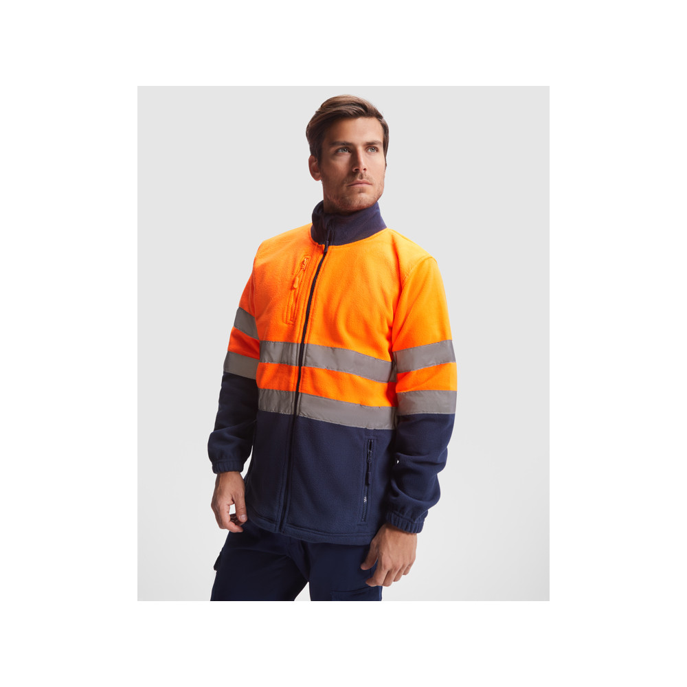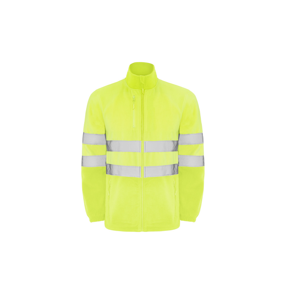 Veste style polaire haute visibilité. Zip avant avec protège-menton. Deux bandes réfléchissantes horizontales sur la poitrine et les manches. Deux poches avant avec zip ton sur ton et une poche sur la poitrine. Poignets élastiques et stoppeurs à l'intérieur du bas.