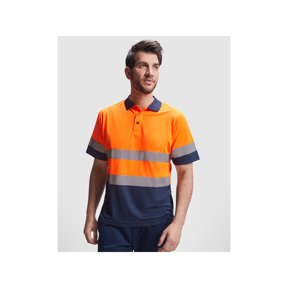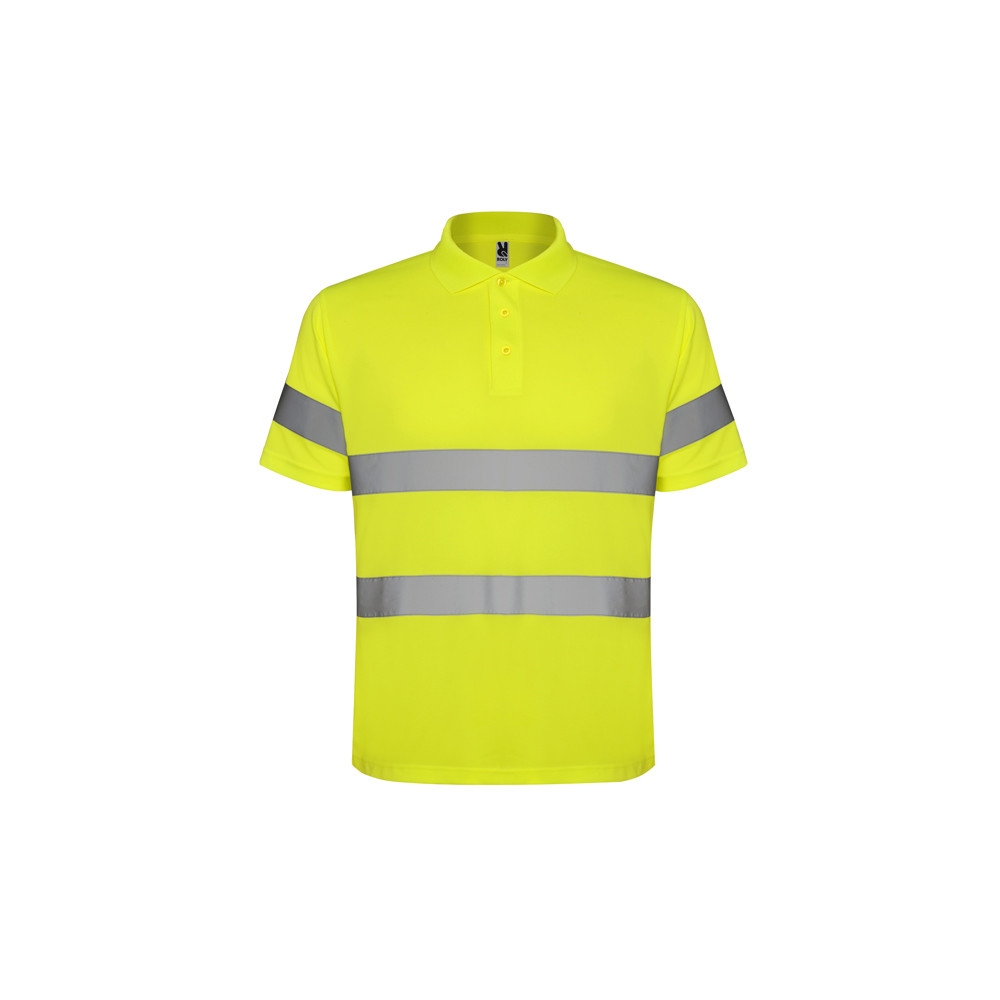 Polo technique manches courtes haute visibilité. Patte de boutonnage 3 boutons. Col et poignets en côte 1x1. Deux bandes réfléchissantes horizontales sur la poitrine et les manches. Tissu anti-accrochage.