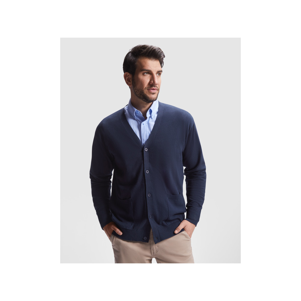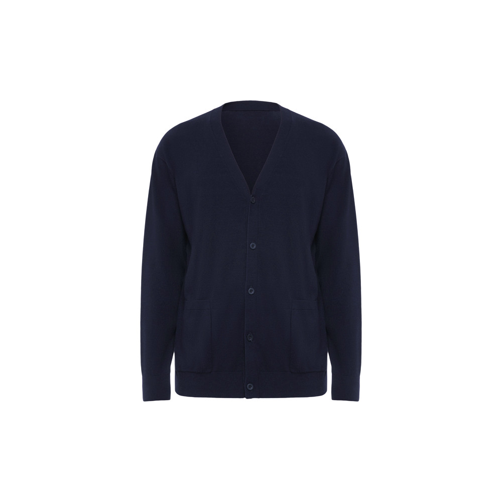 Veste col V. Tissu en tricot doux. Fermeture centrale de cinq boutons au ton. Deux poches de plaston. Poignets et taille élastiques en côte 1x1.