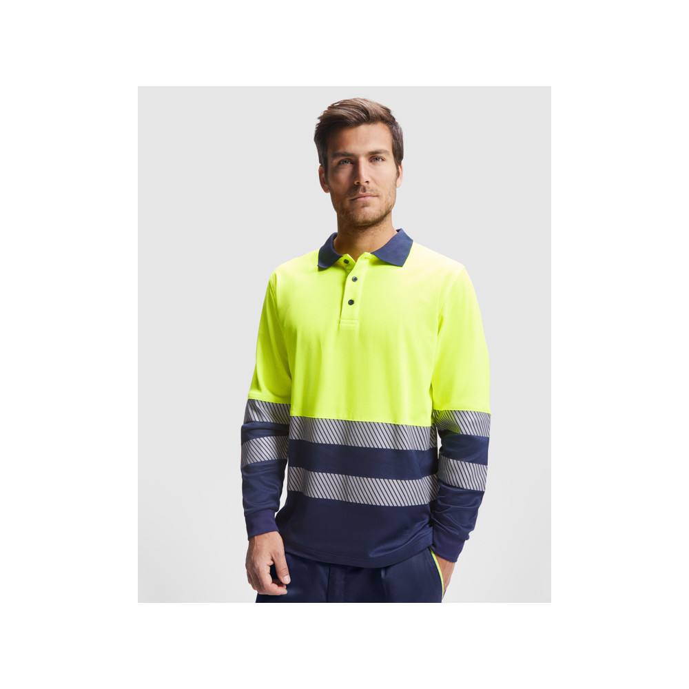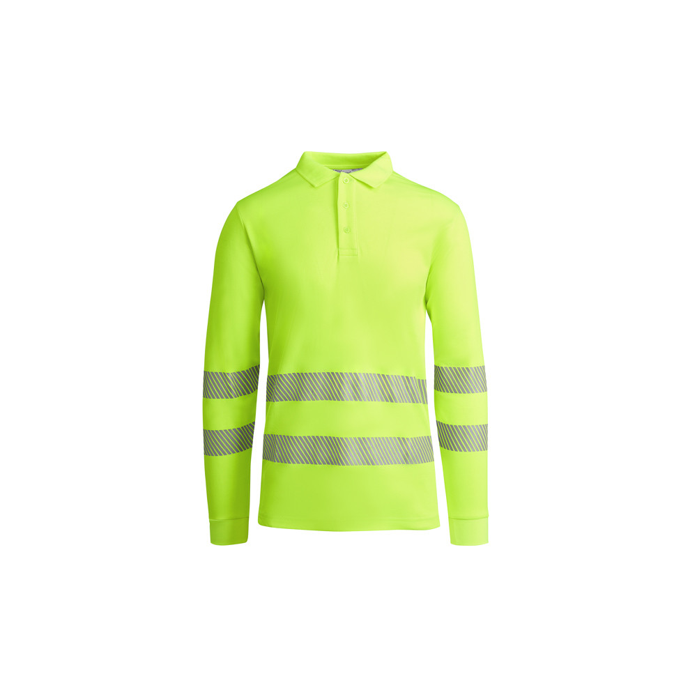 Polo technique haute visibilité à manches longues.· Col et poignets contrastés en côte 1x1.· Deux bandes segmentées haute visibilité sur la poitrine et les manches.· Patte de boutonnage contrastée à 3 boutons.· Tissu mélangé confortable en polyester et coton pour plus de respirabilité.· Poche en option.