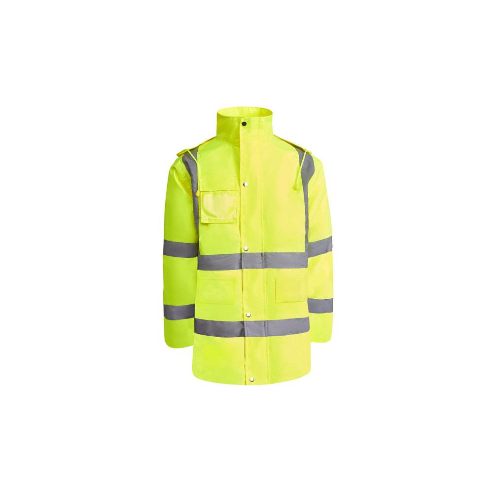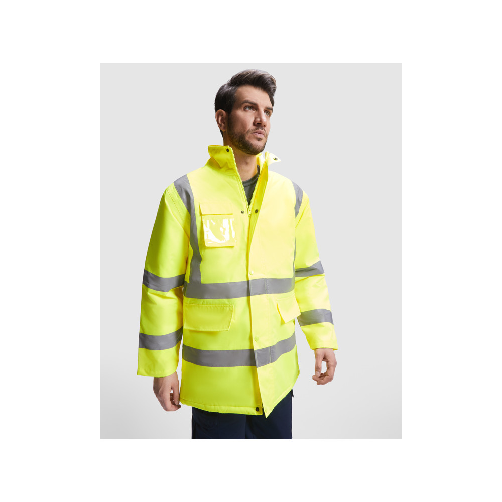 Parka haute visibilité. Tissu imperméable avec coutures thermosoudées. Bandes haute visibilité. Capuche pliable avec cordon de serrage réglable. Poche poitrine à rabat, velcro et badge d'identification. Deux poches sur le devant à rabat. Poche intérieure zippée. Poignets en côte dissimulés 1x1. Patte de boutonnage sur le devant et fermeture éclair double sur le devant. Accès pour la sérigraphie.