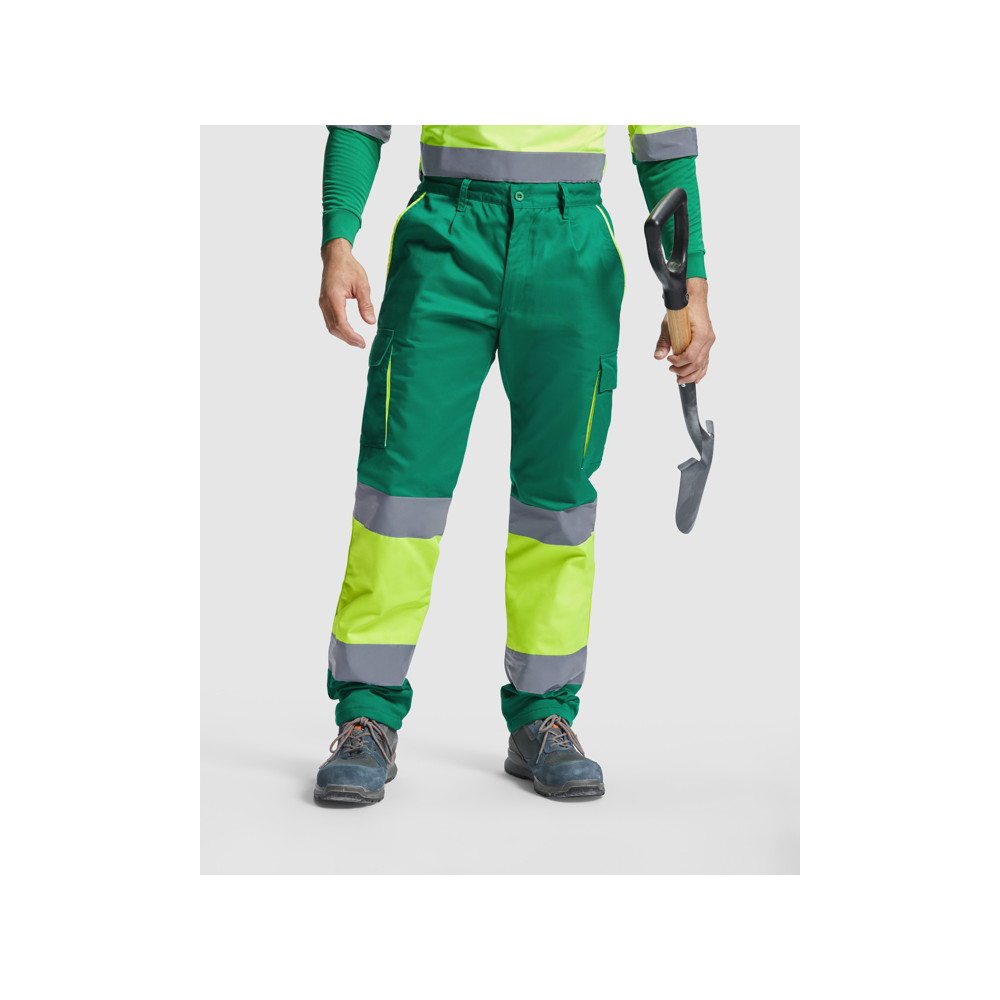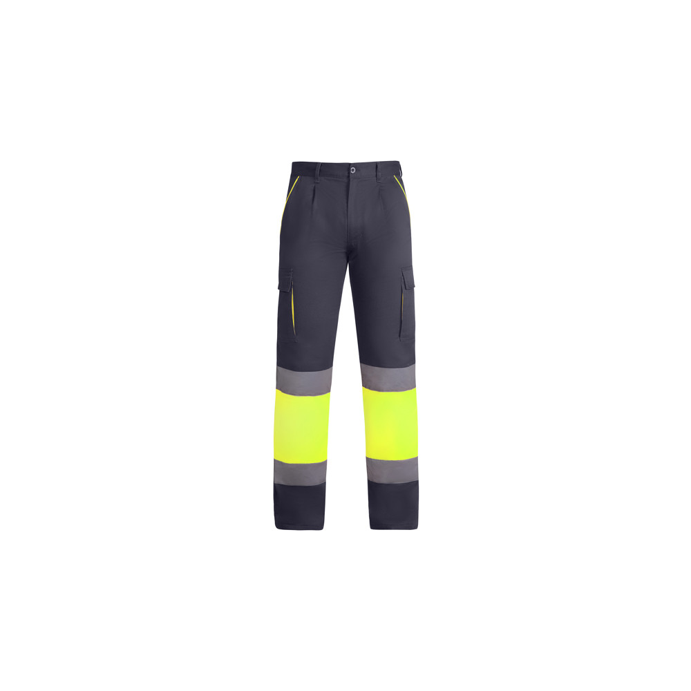 Pantalon haute visibilité doublé à poches multiples. · Combinaison bicolore et bandes haute visibilité.· Détails contrastants fluo sur les poches.· Doublure en polaire.· Ceinture élastique au dos.· Deux poches sur le devant.· Deux poches arrière avec rabat et fermeture velcro.· Deux poches latérales plissées avec rabat et fermeture velcro.
